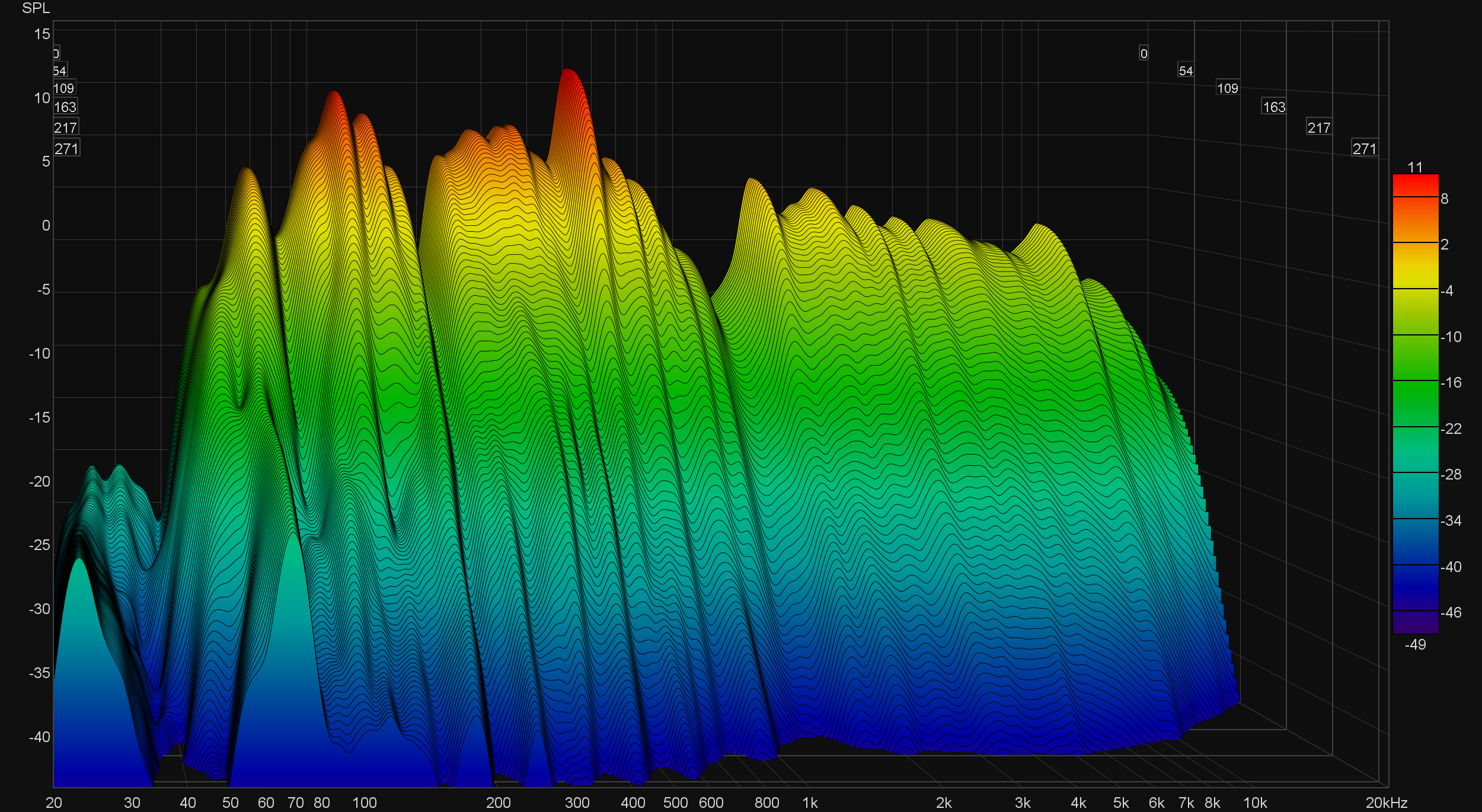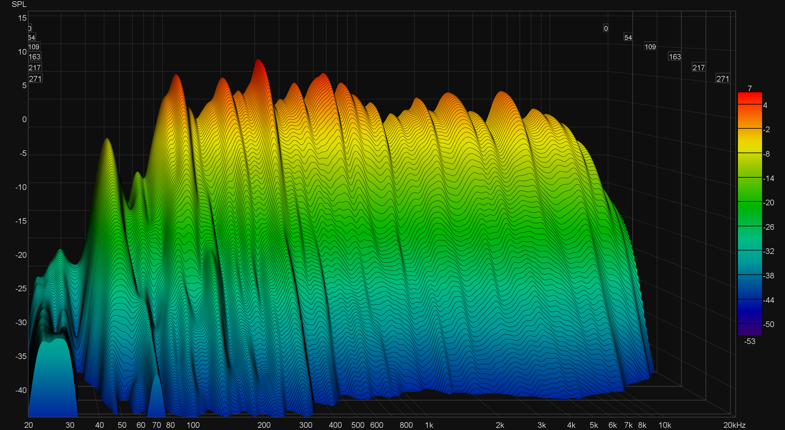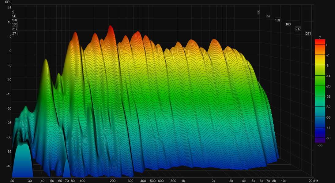 Несмотря на пластиковый корпус без какого-либо мягкого наполнителя внутри, к «гудению-бубнению» акустика не очень склонна, что хорошо видно по графику кумулятивного затухания спектра (он же «водопад» или waterfall). Заметный пик в суббасе вызван вибрацией корпуса, от которой не спасают небольшие резиновые ножки. Ну а пиком в районе 70 Гц мы явно обязаны пассивным излучателям.
