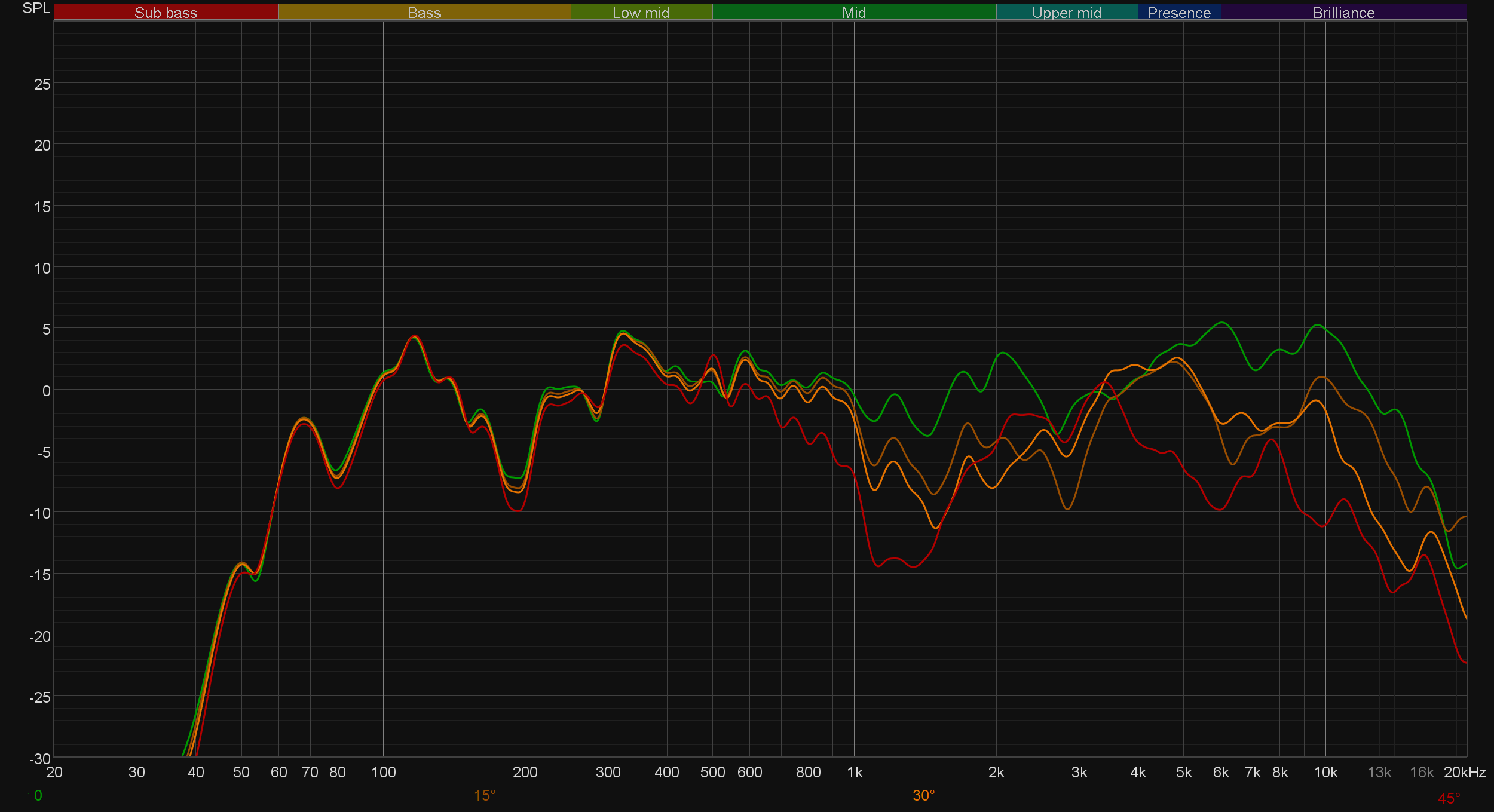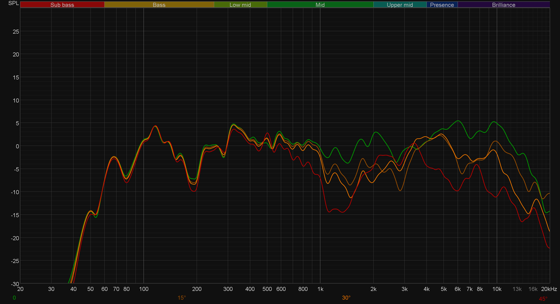 Посмотрим на горизонтальную дисперсию звука, разворачивая колонку относительно микрофона. Видно, что даже сравнительно небольшое смещение серьезно влияет на воспроизведение средних и высоких частот. Ну и чем дальше — тем заметнее этот эффект. Из чего можно сделать вывод, что Sven PS-380 важно направлять прямо на слушателя, если хочется получить максимально возможное качество звука.