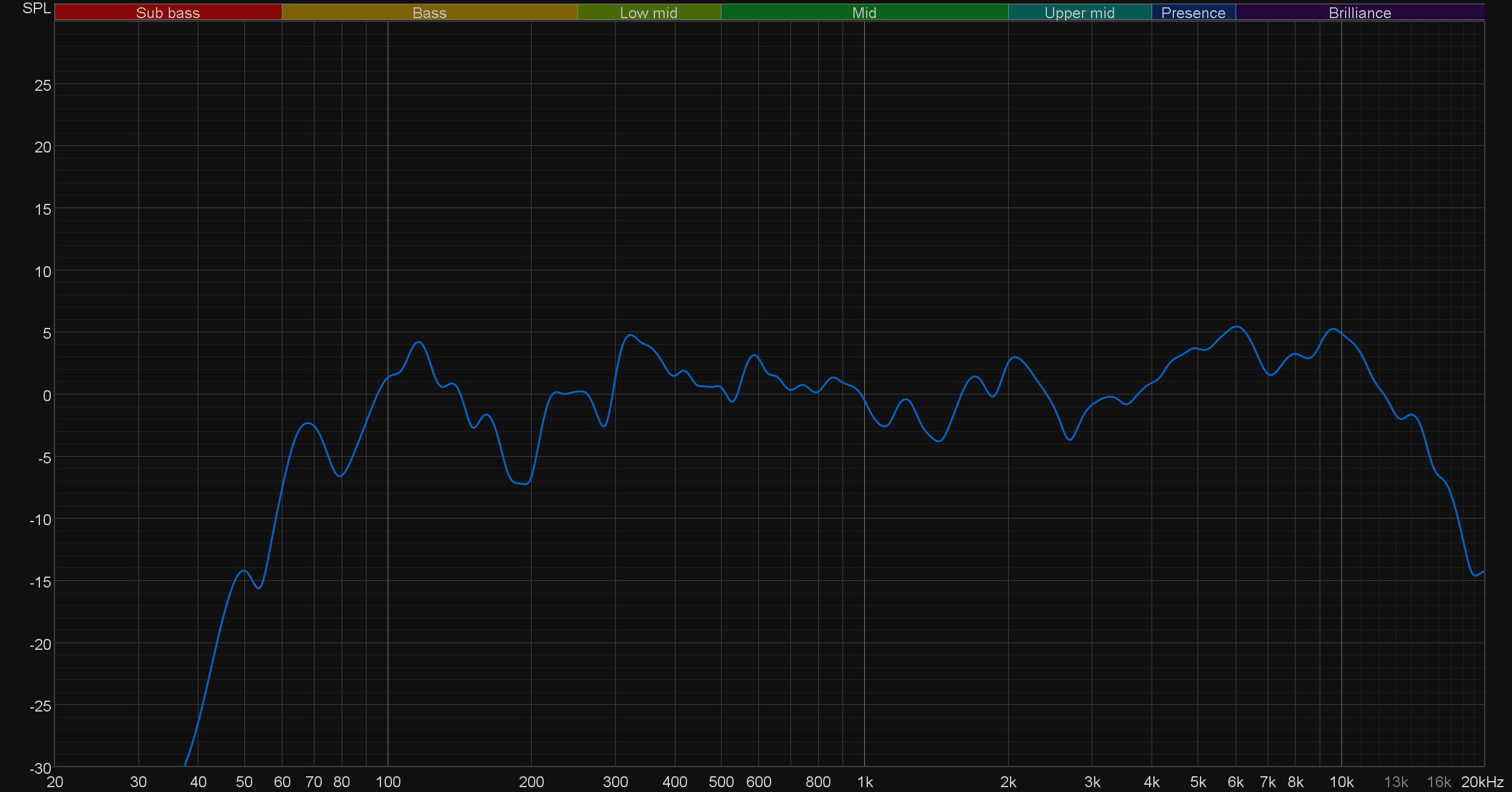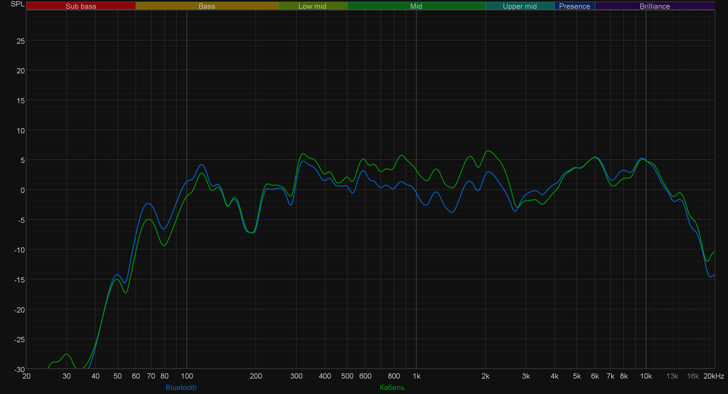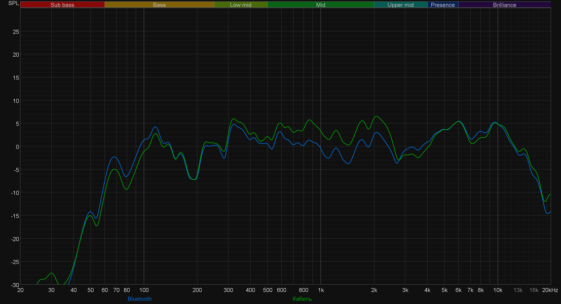 Смена типа подключения с беспроводного на проводное немного меняет картину, но не особенно сильно — пожалуй, отметить стоит лишь небольшое выделение середины, которое больше заметно на графике, чем при реальном прослушивании. Bluetooth-подключение явно является приоритетным и более часто используемым, потому далее будем ориентироваться на него.