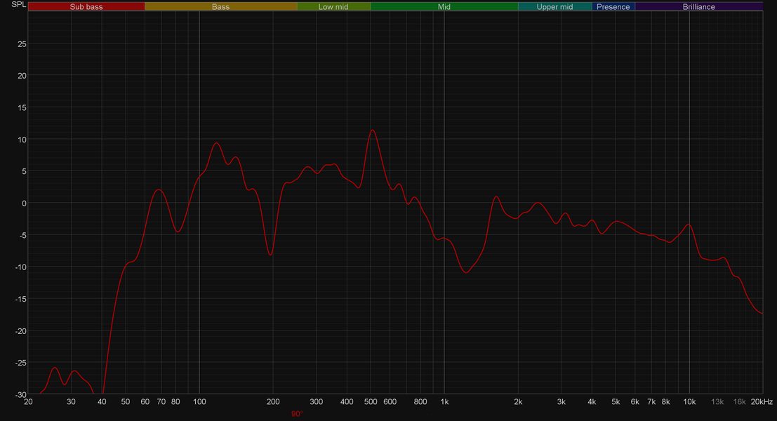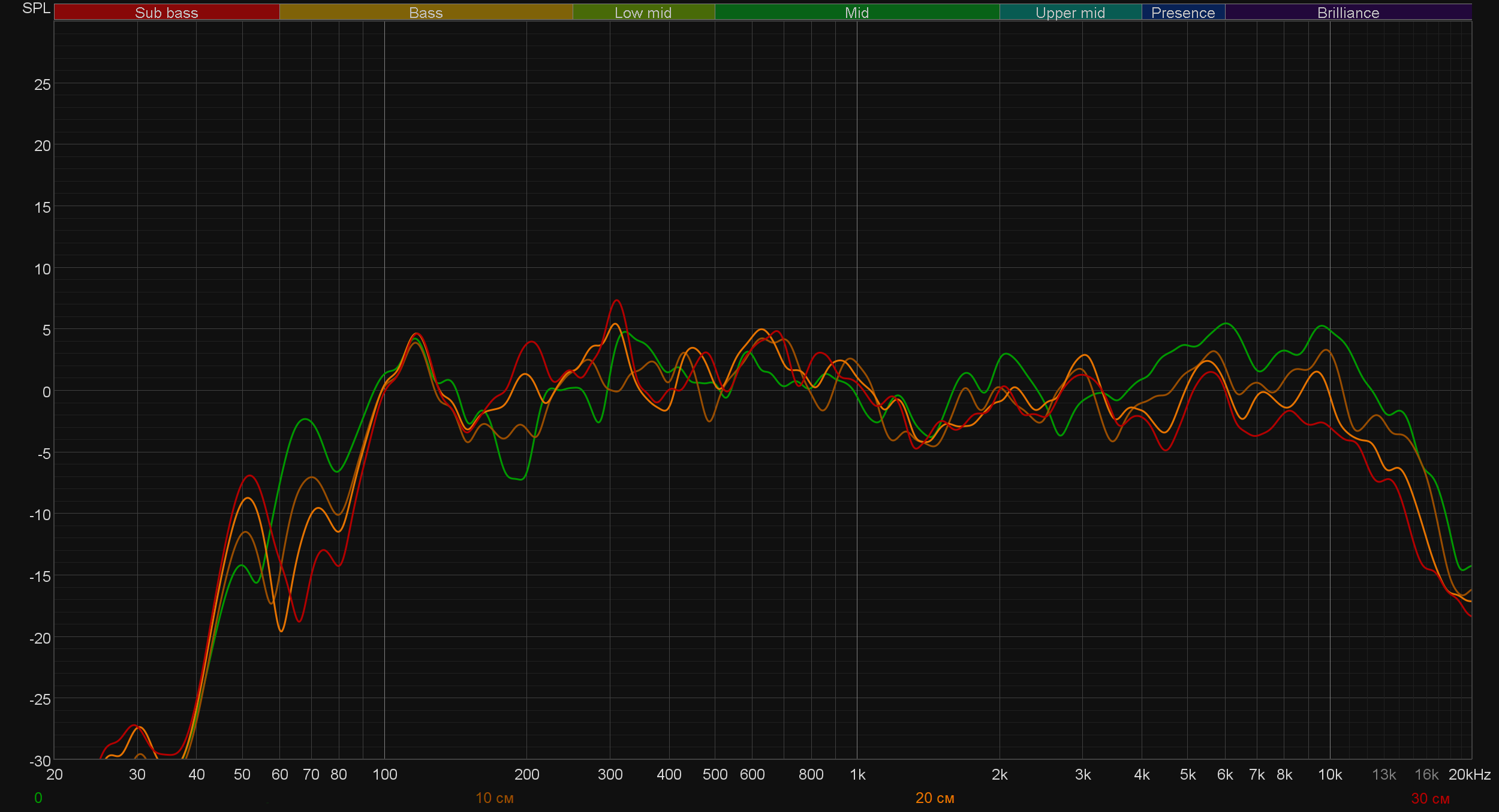 Ради интереса направим микрофон прямо на один из пассивных излучателей. Бас и нижняя середина получают дополнительный акцент. Но, честно говоря, не настолько явный, как мы рассчитывали. Высокие частоты предсказуемо уходят на задний план.