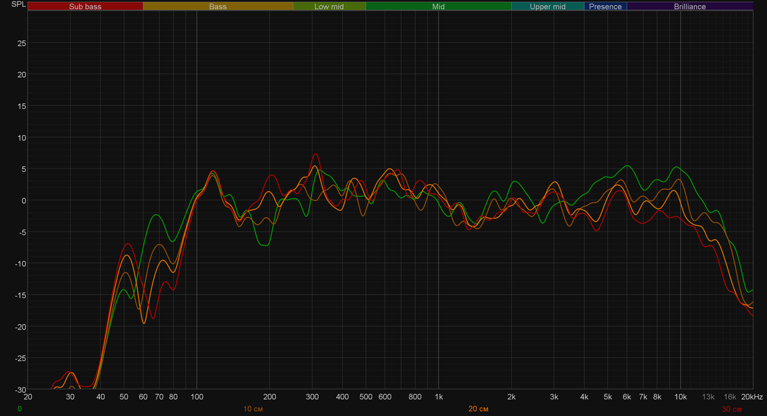 Ну и под конец попробуем поднять измерительный микрофон над колонкой — видно, что в целом качество звука если и падает, то незначительно. Вполне можно оставить устройство где-нибудь на столе, а самим танцевать рядом.