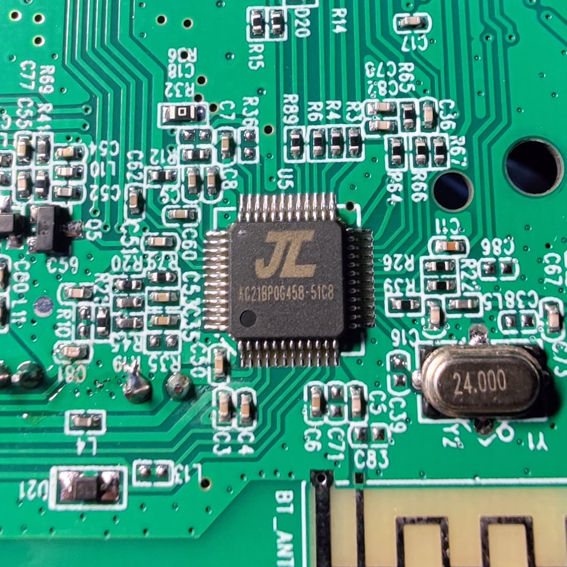 «Мозгом» устройства, отвечающим за поддержку Bluetooth, обработку звука и другие функции, по всей видимости, служит микросхема AC218POG458-51C8 китайского производителя Zhuhai Jieli Technology. К сожалению, даже на официальном сайте компании найти на нее даташит не удалось, так что остается просто строить предположения.