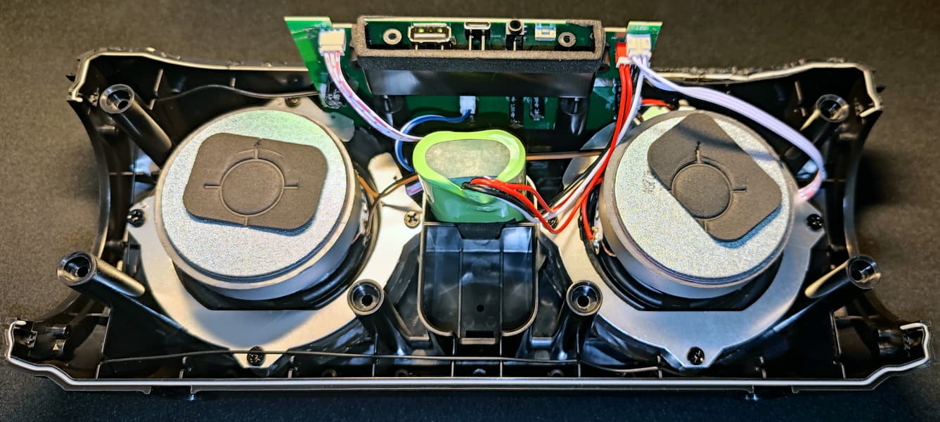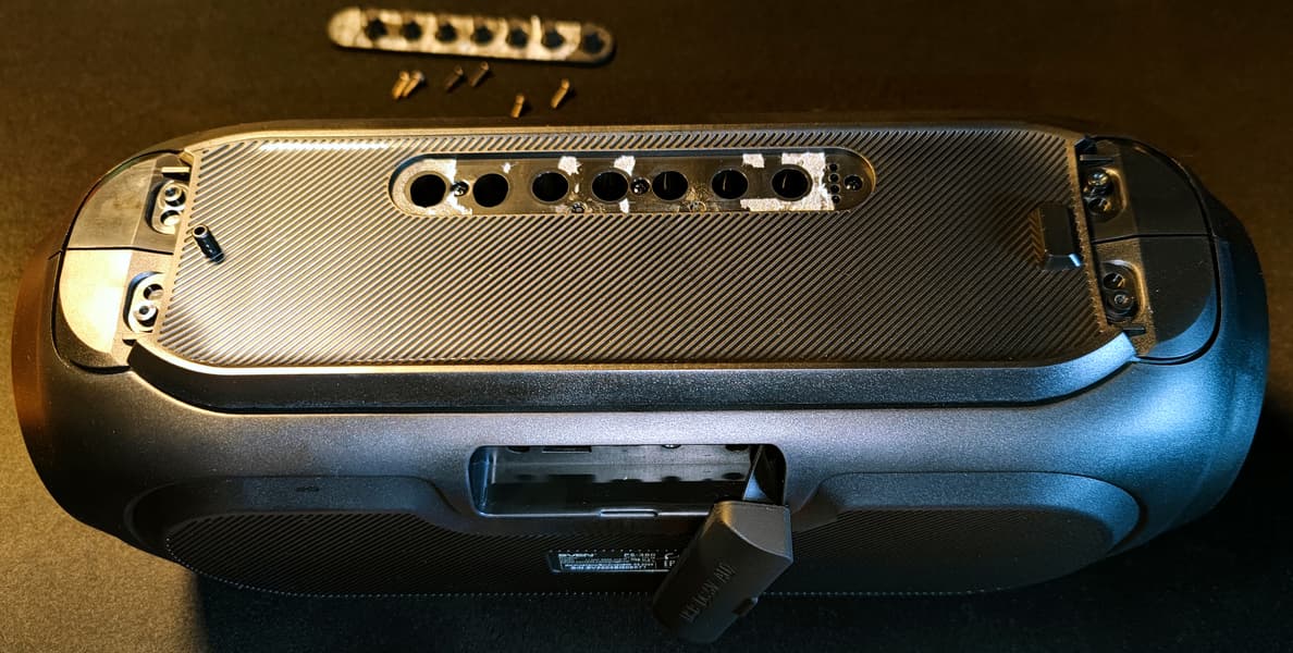 Разобрать Sven PS-380 — целое приключение. Куча креплений, защелки в неожиданных местах — все как мы любим. Видимо, такова плата за водозащиту. Но ничего невозможного все же нет — поехали. Первым делом снимаем ручку и отклеиваем ряд кнопок, под которыми обнаруживаем еще несколько винтов.