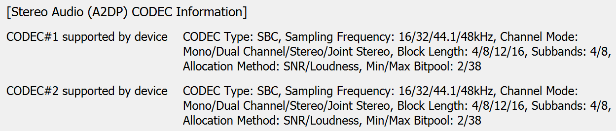 В первую очередь Sven PS-380 — беспроводная акустика, потому начнем с подключения посредством Bluetooth. После выбора соответствующего режима колонка некоторое время ищет «знакомые» устройства, потом активирует сопряжение. Остается найти ее в меню гаджета и подключить. Поддержки мультипойнта нет, что было проверено попыткой подключения к смартфону и ПК под управлением Windows 10. Параллельно с помощью утилиты Bluetooth Tweaker мы традиционно получили полный список поддерживаемых кодеков и их режимов. Кодек только один — SBC, для переносной аудиосистемы его достаточно.