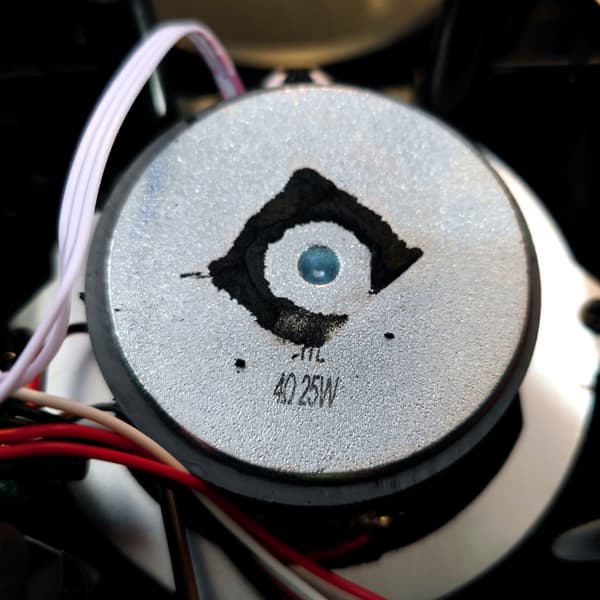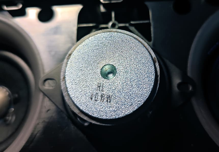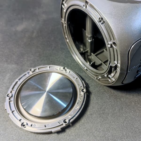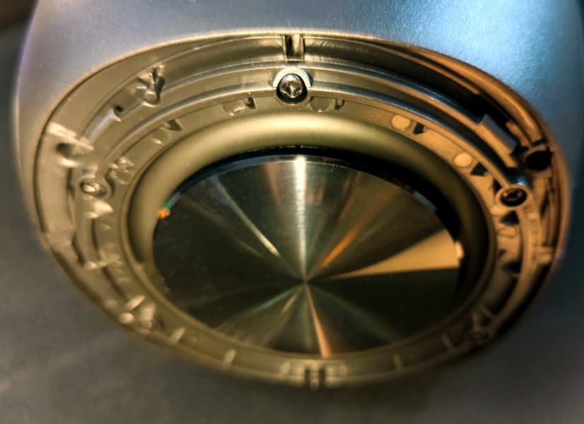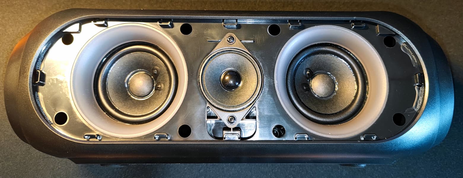 Боковые кольца вокруг пассивных излучателей закреплены на очень тугих защелках. Для демонтажа понадобится некоторое количество терпения. Под кольцом находится еще ряд винтов, удерживающих две половинки корпуса.