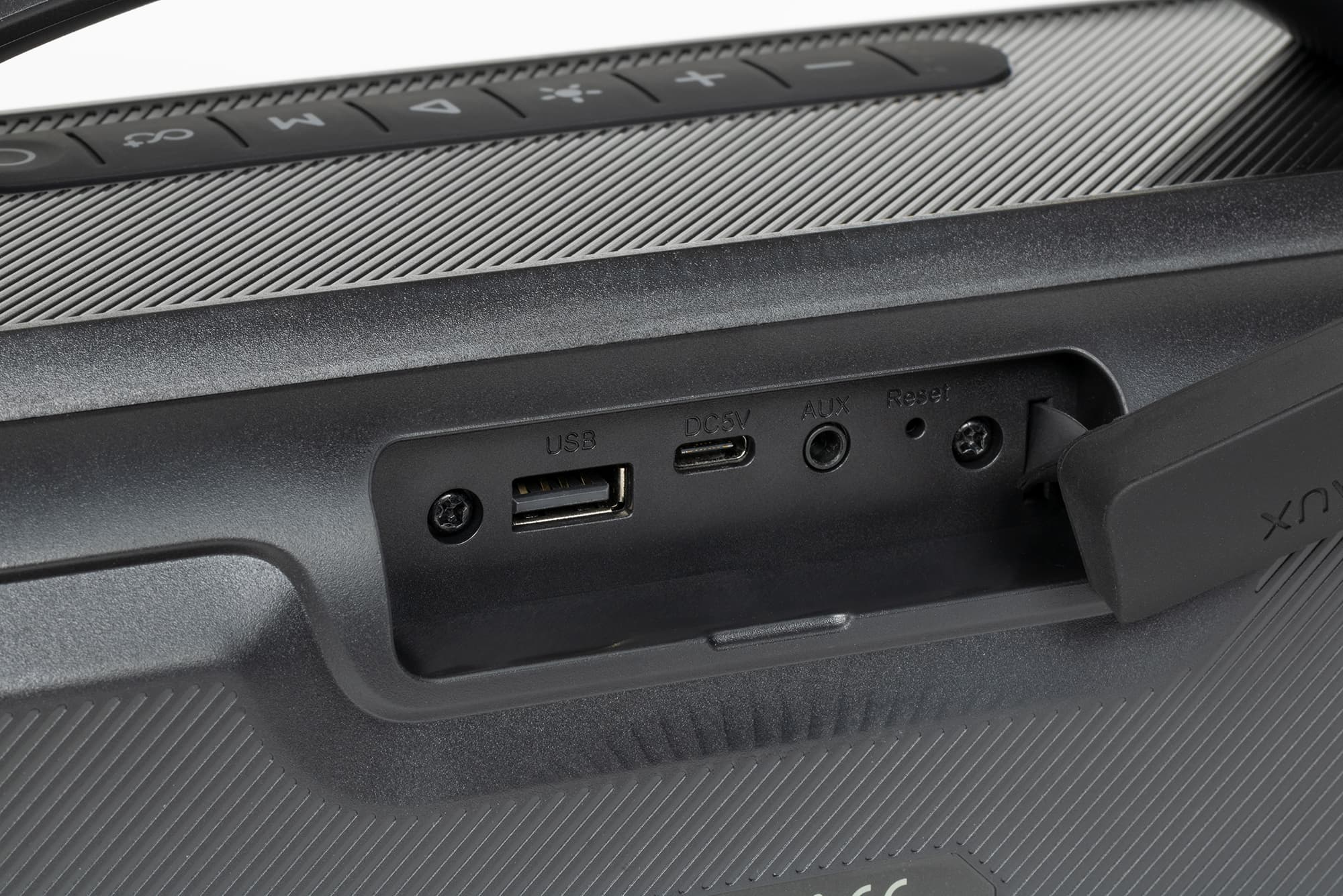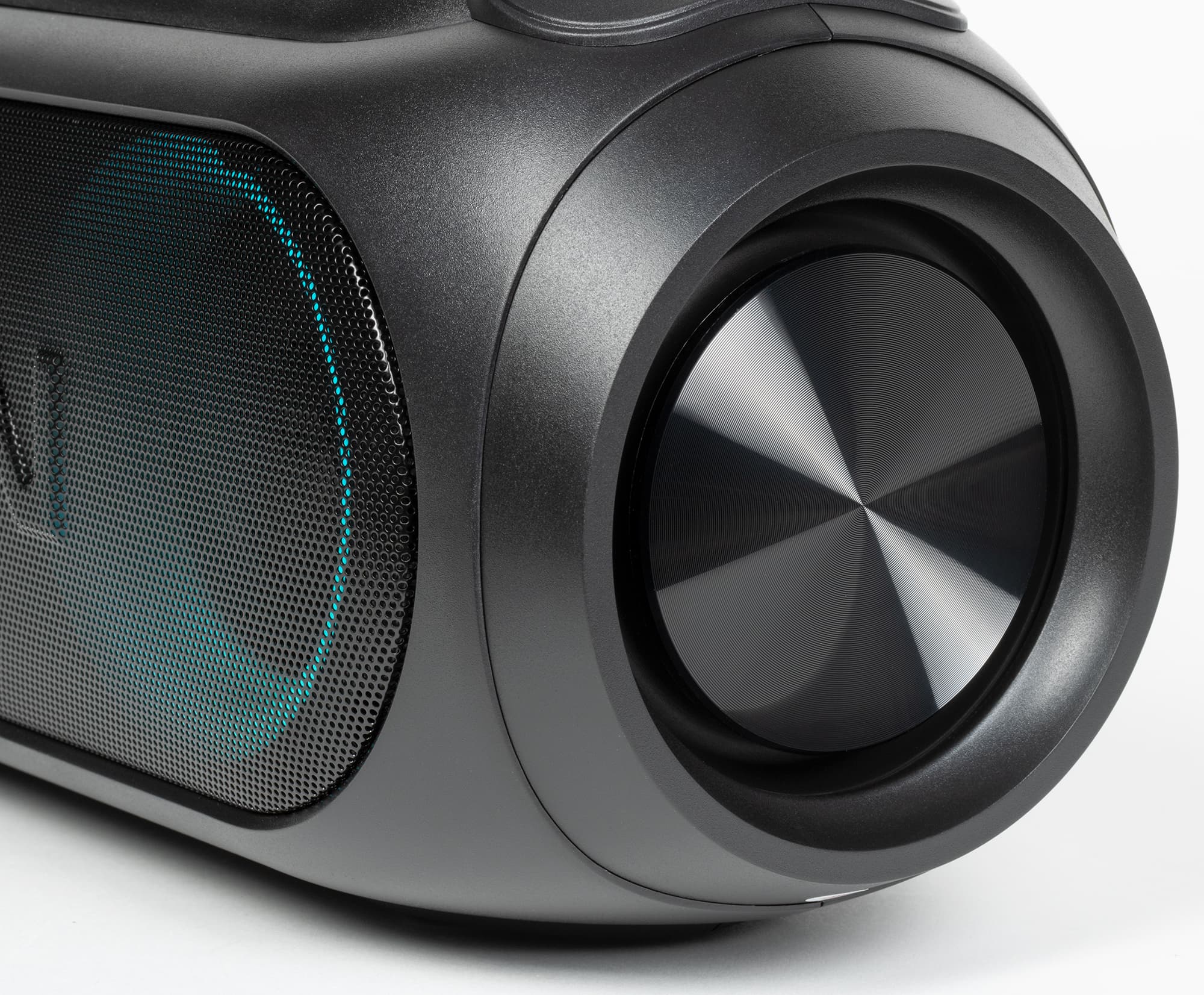 Переносить колонку легко и удобно — как за ручку сверху, так и с помощью наплечного ремня. Что же касается защиты от воды — судя по сборке, с ней все отлично. Заявлен уровень IPХ5, то есть устойчивость к направленным струям воды. Мы не стали слишком усердствовать, но пару раз все же направили душ на колонку с разных сторон. На ее работоспособность или внешний вид это приключение никак не повлияло. Так что водозащита действительно присутствует и работает. С автономностью все традиционно неоднозначно: на средней громкости колонка работала от 8 до 12 часов с включенной подсветкой, что в любом случае очень неплохо — на вечеринку точно хватит.