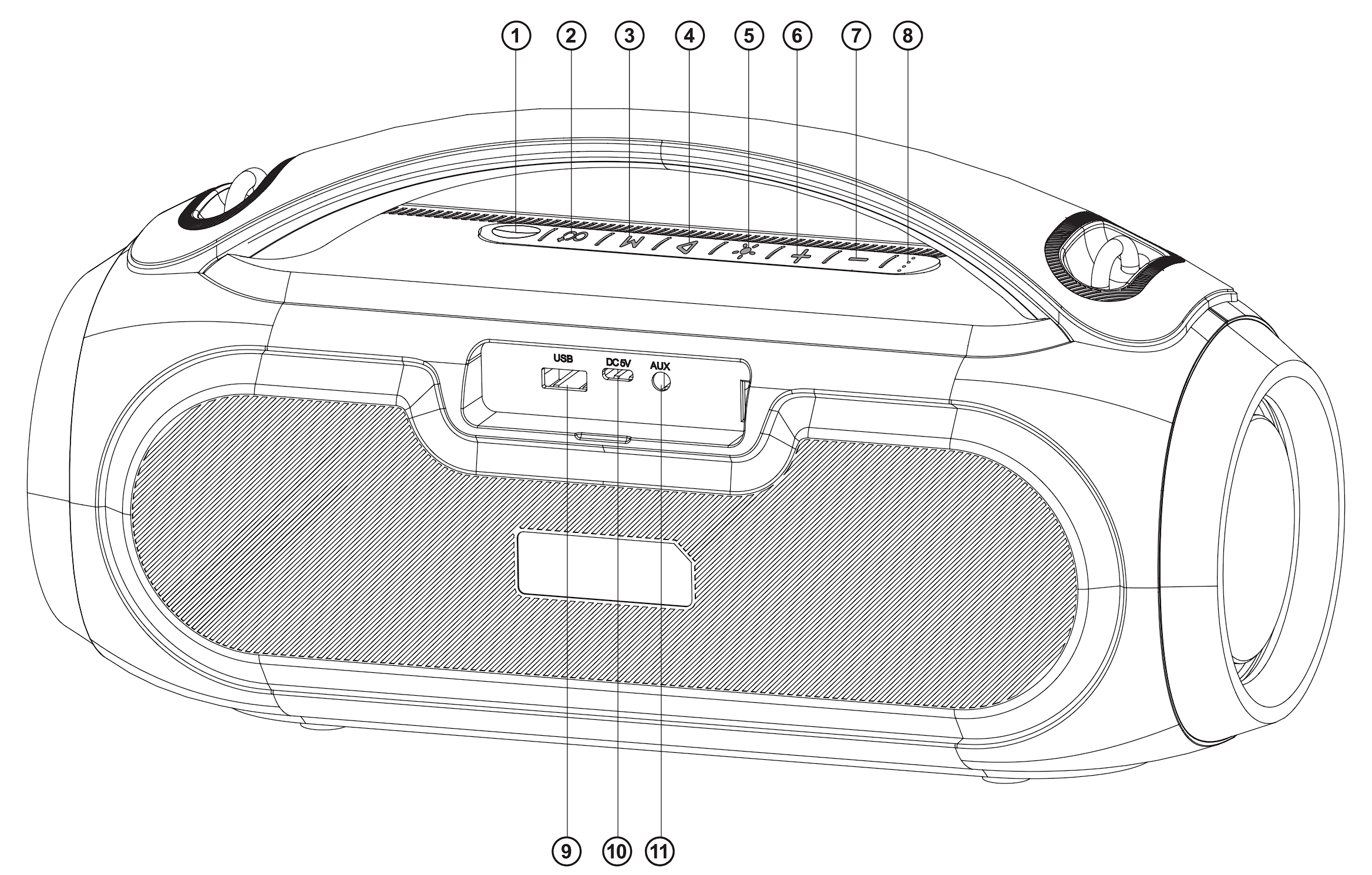- Переключение режимов работы: Bluetooth/Радио/Проигрыватель/Aux