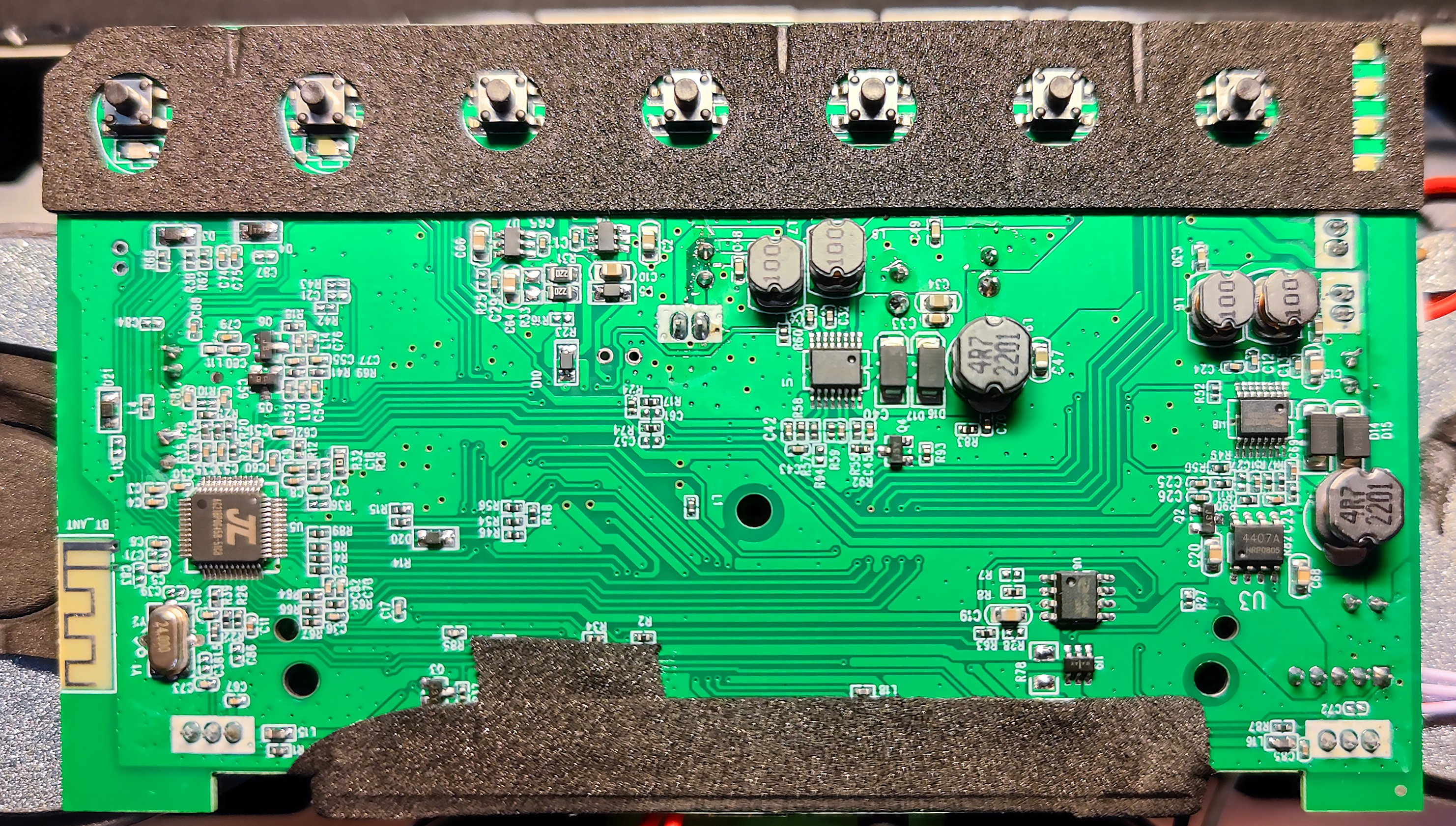Ну и, наконец, плата. К качеству сборки вопросов нет, в верхней части размещены 7 кнопок, в справа от которых виднеются 4 светодиода индикатора заряда батареи.