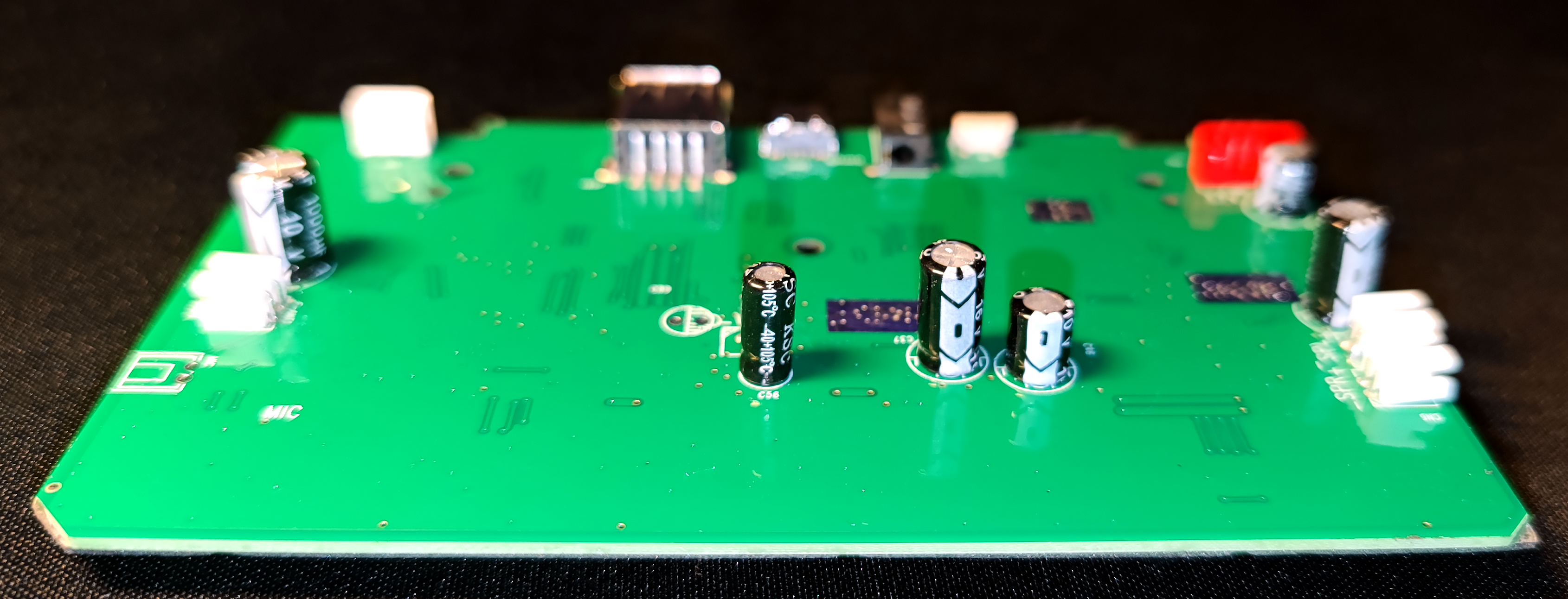 На обратной стороне платы видны разъемы, коннекторы для динамиков и подсветки, а также ряд конденсаторов.