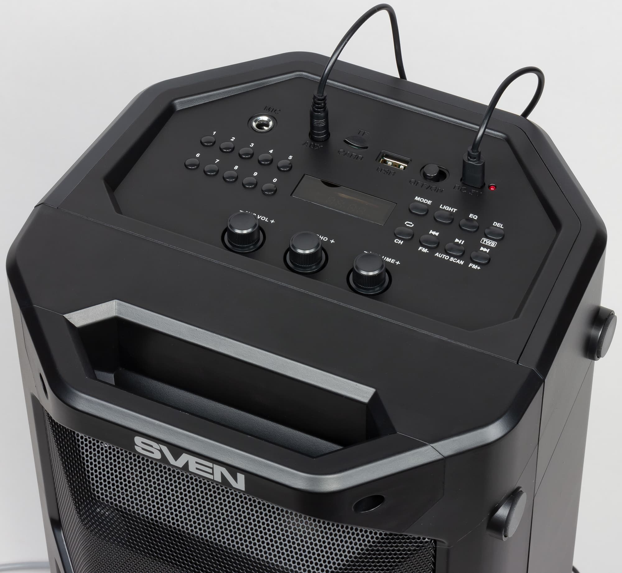 Чуть выше мы уже вспомнили про караоке. Возможность подключения микрофона — отличительная черта всех бумбоксов Sven. Как и у других моделей, у Sven PS-600 есть два регулятора работы микрофона. С помощью одного настраивается громкость, с помощью другого — выраженность эффекта эха, с помощью которого можно придать голосу немного дополнительного объема.