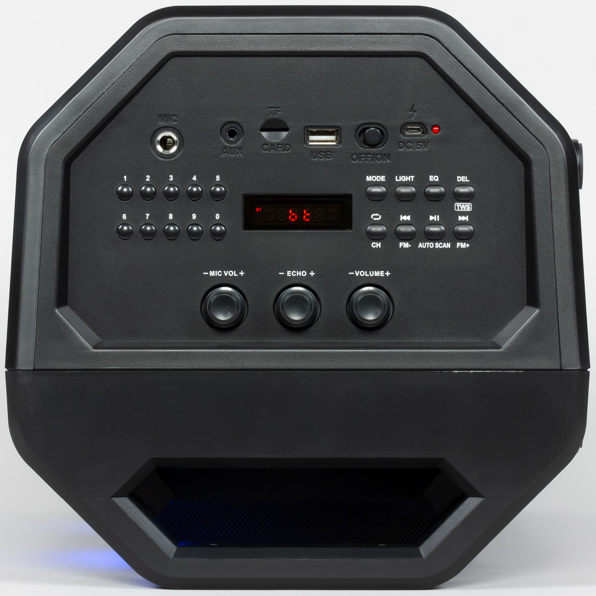 Подсветка у Sven PS-600 немного отличается от «младших» моделей. Два источника света расположены над динамиками. Света они дают немного, но вполне могут помочь создать романтическую обстановку или наоборот — подтолкнуть гостей собраться на импровизированном танцполе. Оказываемое действие зависит от режима, который можно выбрать клавишей Light. Долгое ее нажатие, кстати, отключает подсветку полностью.