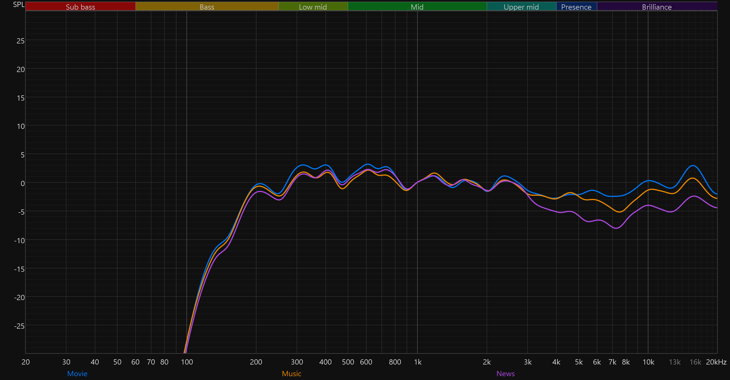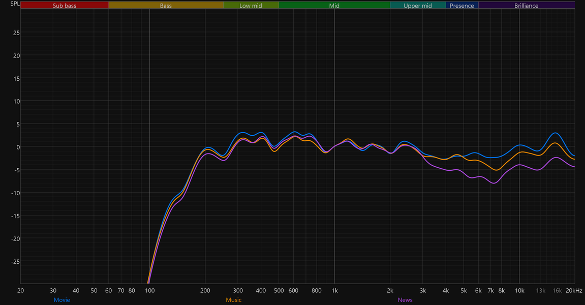 Самый ровный и сбалансированный режим — «Movie»: благодаря легкому акценту на нижнюю середину и равномерной подаче остального диапазона он звучит наиболее приятно. Его и будем рассматривать в качестве основного. Пресет «Music» подчеркивает середину за счет небольшого провала в верхах — иногда это неплохо срабатывает, особенно на вокале и соло-партиях, которые звучат чуть ярче. Но в целом — спорный вариант. Ну а с режимом «News» все предсказуемо: акцент делается на речевом диапазоне.
