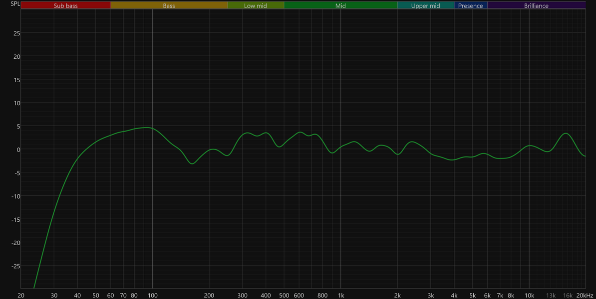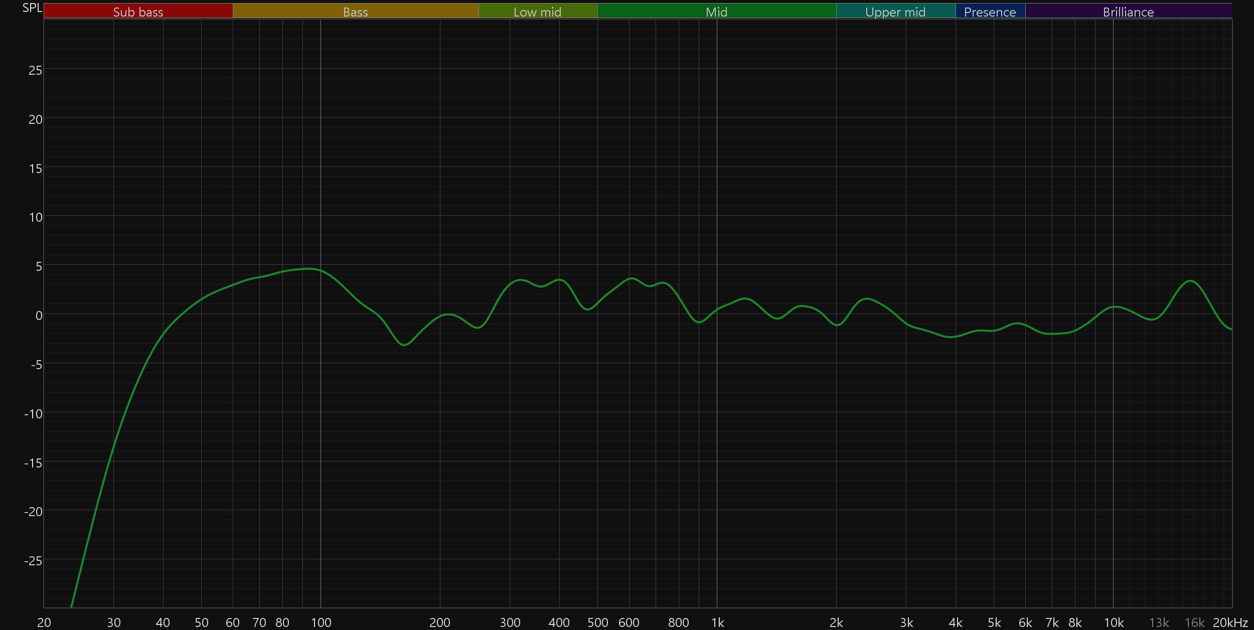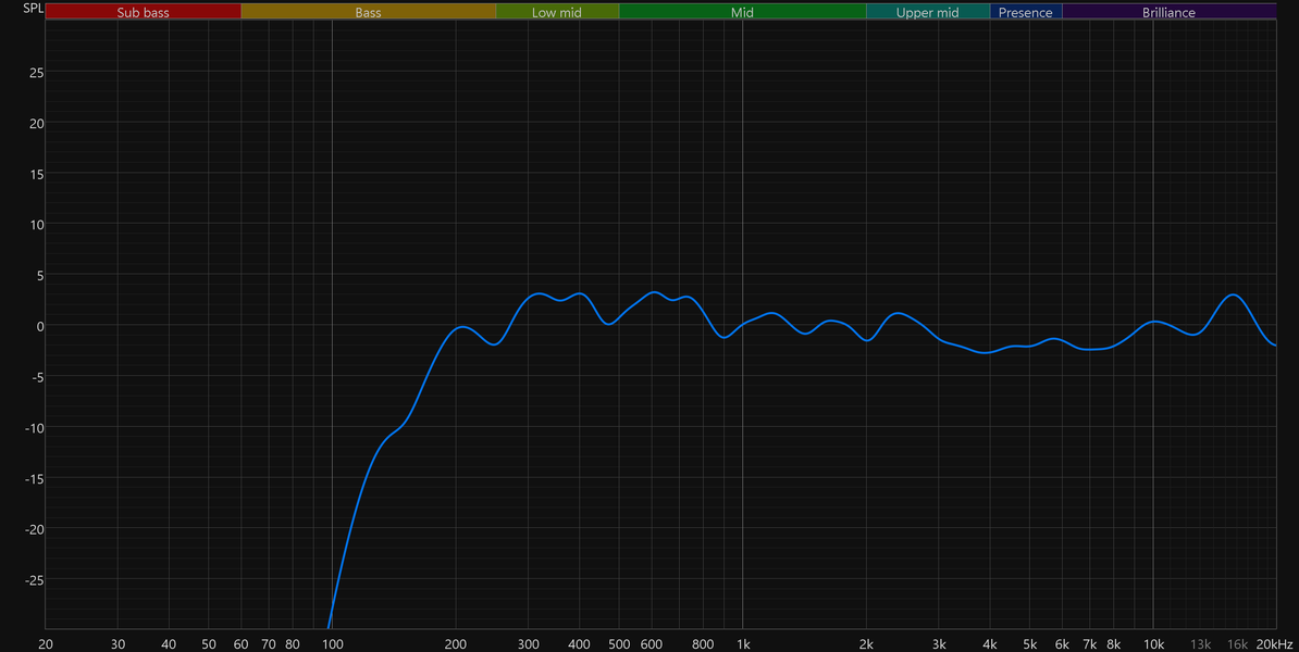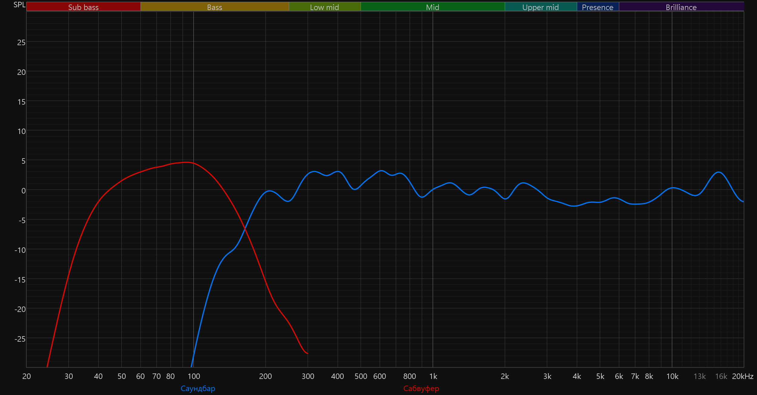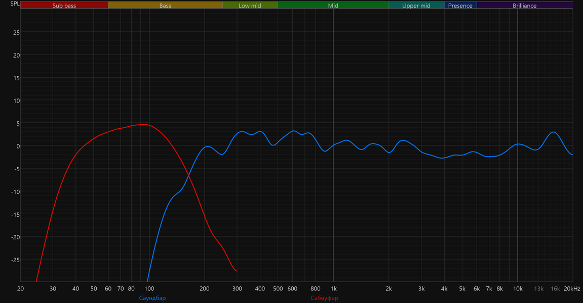 Теперь добавим в систему сабвуфер. Еще раз подчеркнем: выраженность баса будет зависеть от его громкости и особенностей размещения. В целом он звучит довольно гулко — сказывается отсутствие демпфирующего материала внутри. Но для устройства, ориентированного в первую очередь на просмотр кино, это не слишком критично — в сценах со спецэффектами такая подача порой даже играет на руку. Зато по нижней границе все неплохо: саббас покрывается с 40 Гц. В районе 150 Гц заметна небольшая несостыковка между сабвуфером и саундбаром — типичная проблема для среднебюджетного сегмента. Сабвуфер на этих частотах уже отыграл свое, а саундбар пока молчит — образуется провал, из-за которого звучание теряет плотность в нижней середине. Впрочем, на слух он воспринимается мягче, чем можно было бы ожидать по графикам.