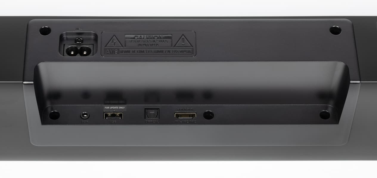 На задней панели саундбара, помимо разъема питания, находятся основные интерфейсы для подключения источников звука: аналоговый вход (миниджек 3,5 мм), порт USB-A для воспроизведения с внешних накопителей, оптический цифровой вход и HDMI с поддержкой ARC. По умолчанию USB-порт служит только для обновления ПО, для активации функции проигрывания аудиофайлов необходимо удерживать кнопку Dolby на пульте ДУ в течение 10 секунд — до появления на экране надписи «USB ON».