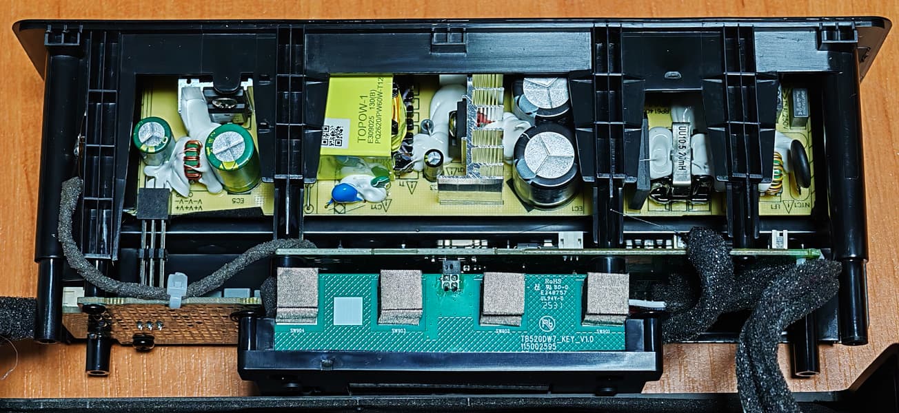 Задняя панель саундбара закреплена с помощью нескольких винтов и легко демонтируется. С обратной стороны на ней размещены три платы, отвечающие за питание, обработку сигнала и усиление. Отдельно вынесена небольшая плата, обеспечивающая управление устройством и работу экрана, на ней сверху размещены контактные площадки сенсоров. Дальнейший демонтаж тоже возможен, устройство вполне ремонтопригодно. Однако значительная часть разъемов и мест креплений обильно залита компаундом, попытки удалить который чреваты нарушением их целостности, потому от полного разбора пришлось воздержаться. К счастью, все самое интересное видно и так.