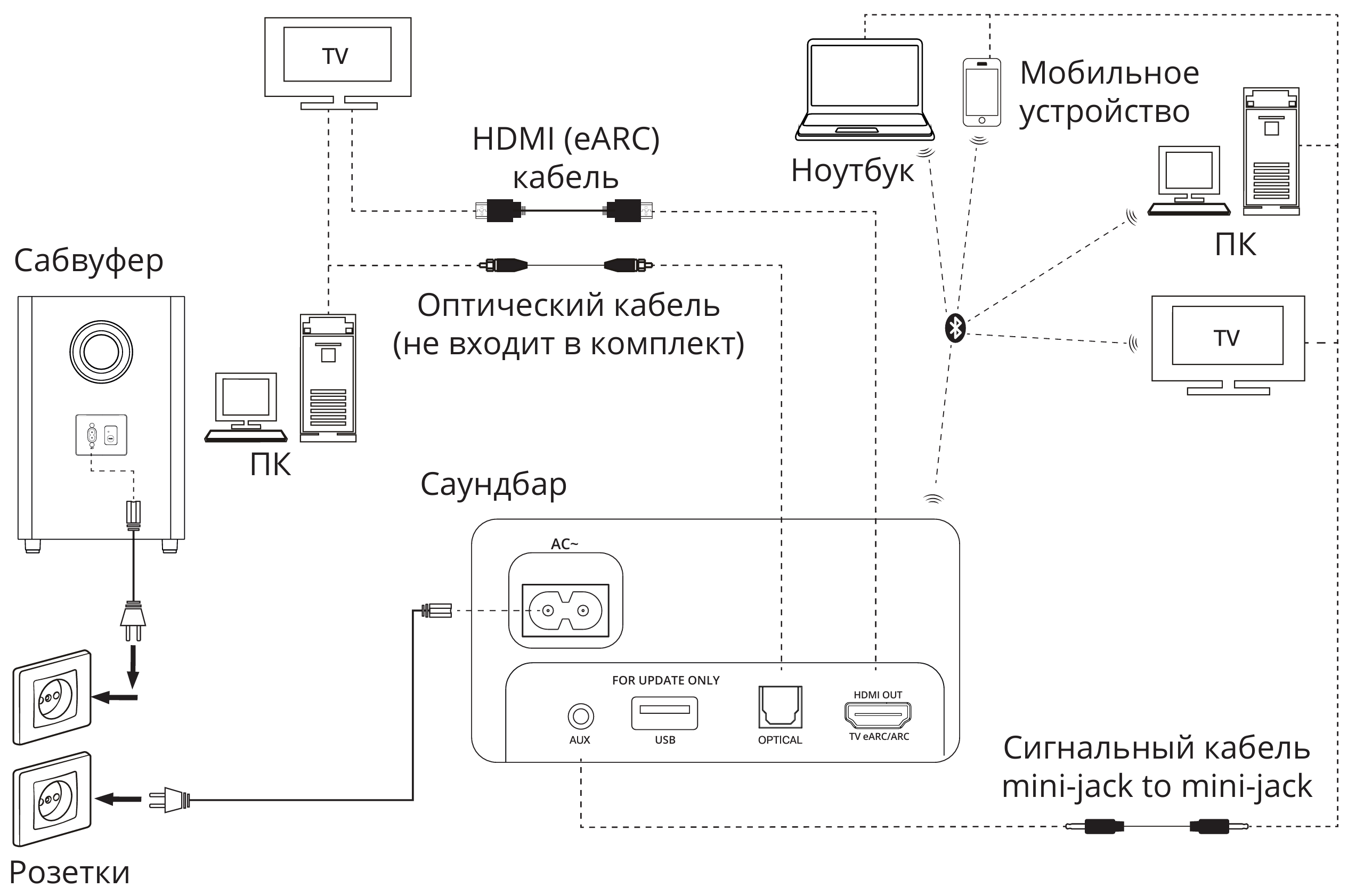 | Интерфейсы | Bluetooth, Aux (миниджек 3,5 мм), HDMI (eARC), S/PDIF (Optical) |