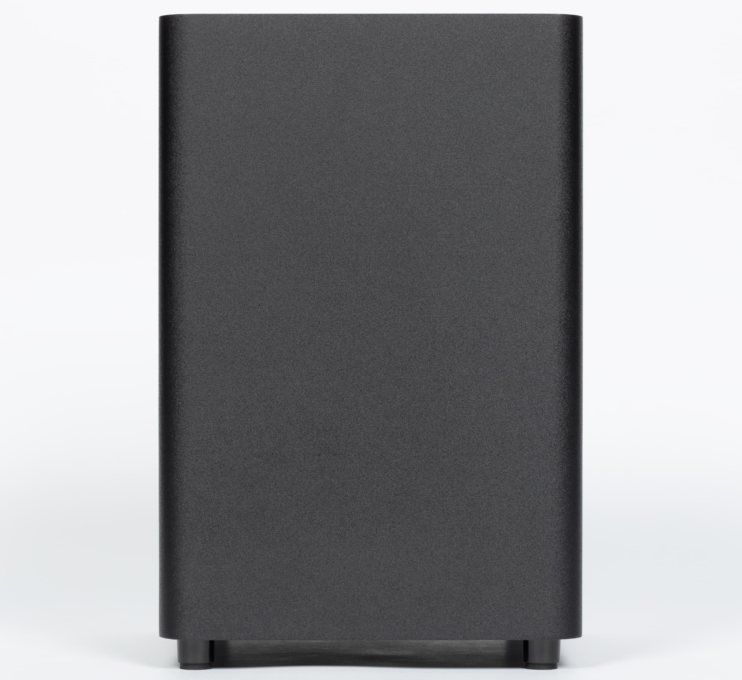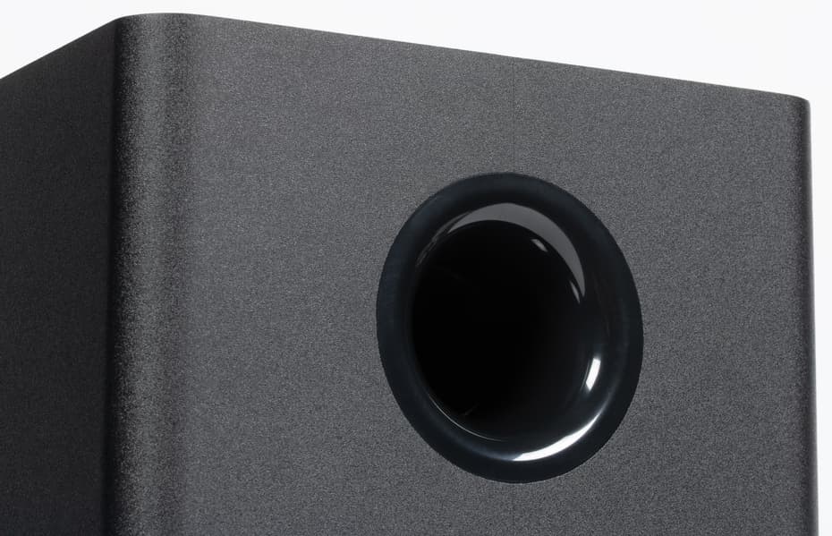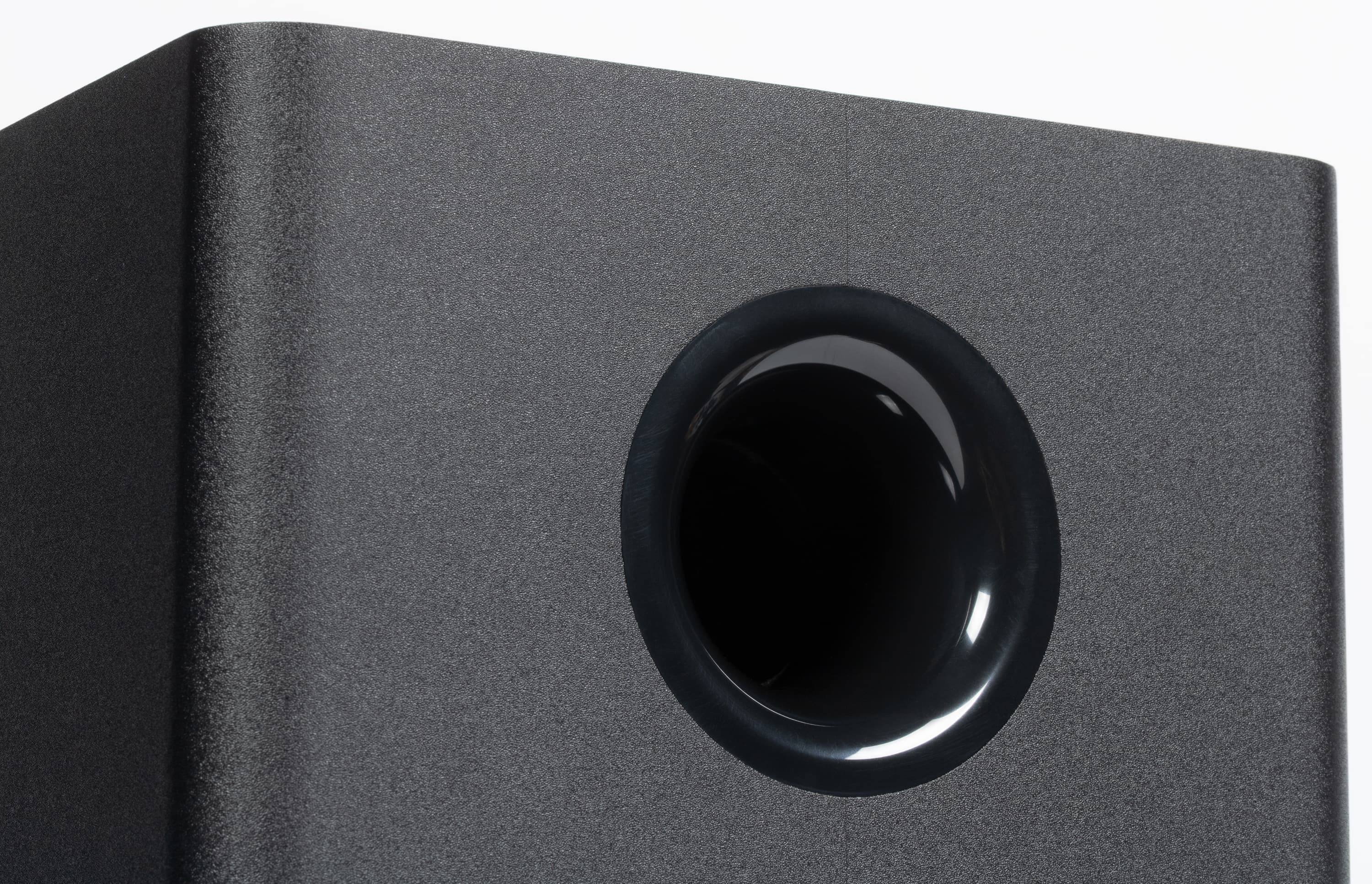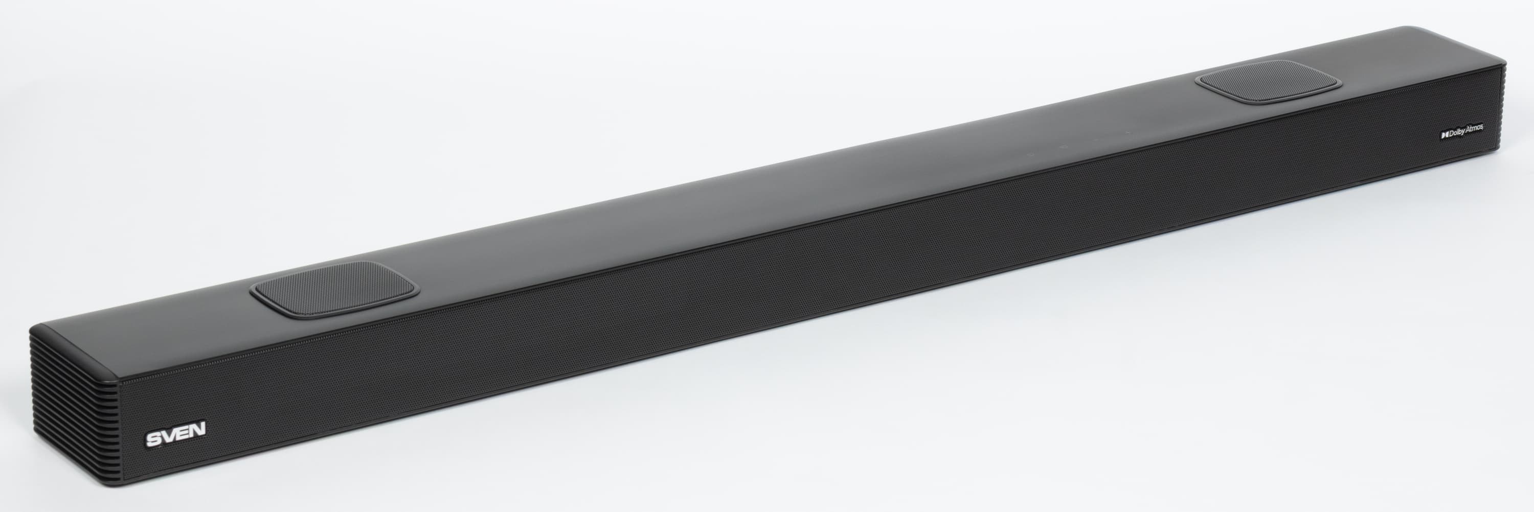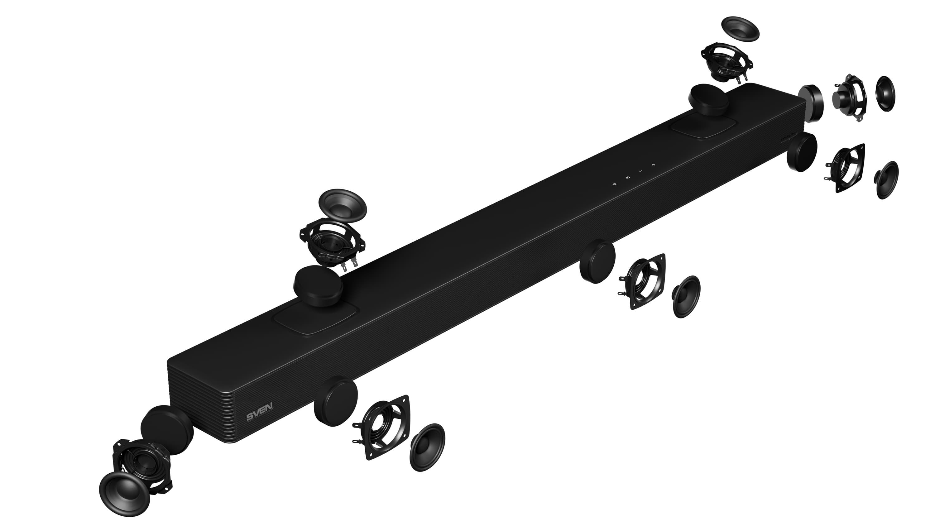 В саундбаре использовано семь динамиков. Три фронтальных формируют центральный, левый и правый каналы. Динамики объемного звучания вынесены в торцы и на верхнюю панель корпуса, их посадочные места повернуты под небольшим углом к слушателю, чтобы улучшить локализацию эффектов.