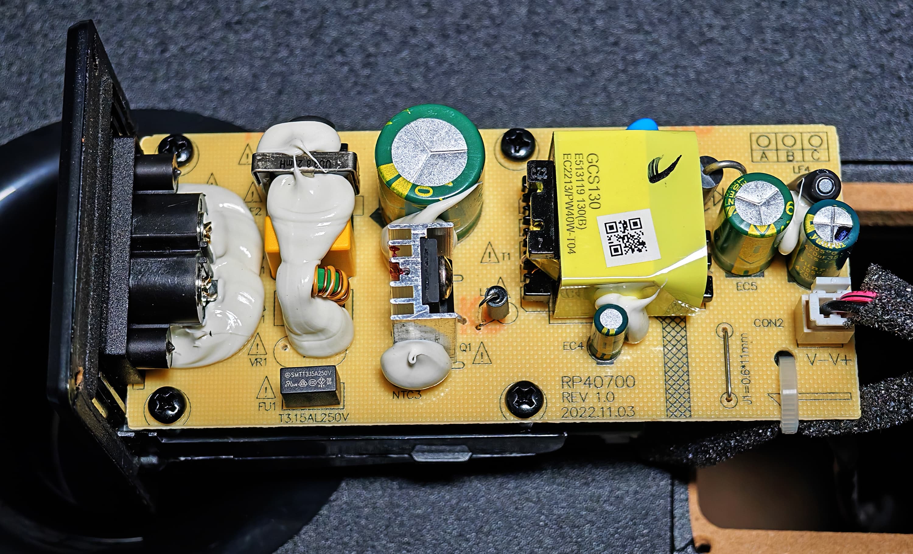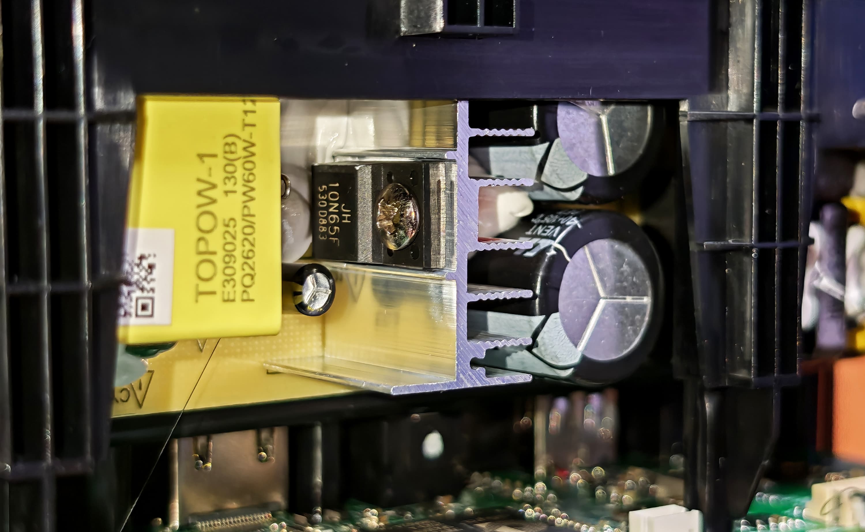Импульсный блок питания находится на отдельной плате, что немного снижает уровень наводок, и построен по типовой архитектуре. Ключевой транзистор 10N65F установлен на довольно массивном радиаторе, рядом размещены трансформатор TOPOW‑1 и электролитические конденсаторы фильтрации.