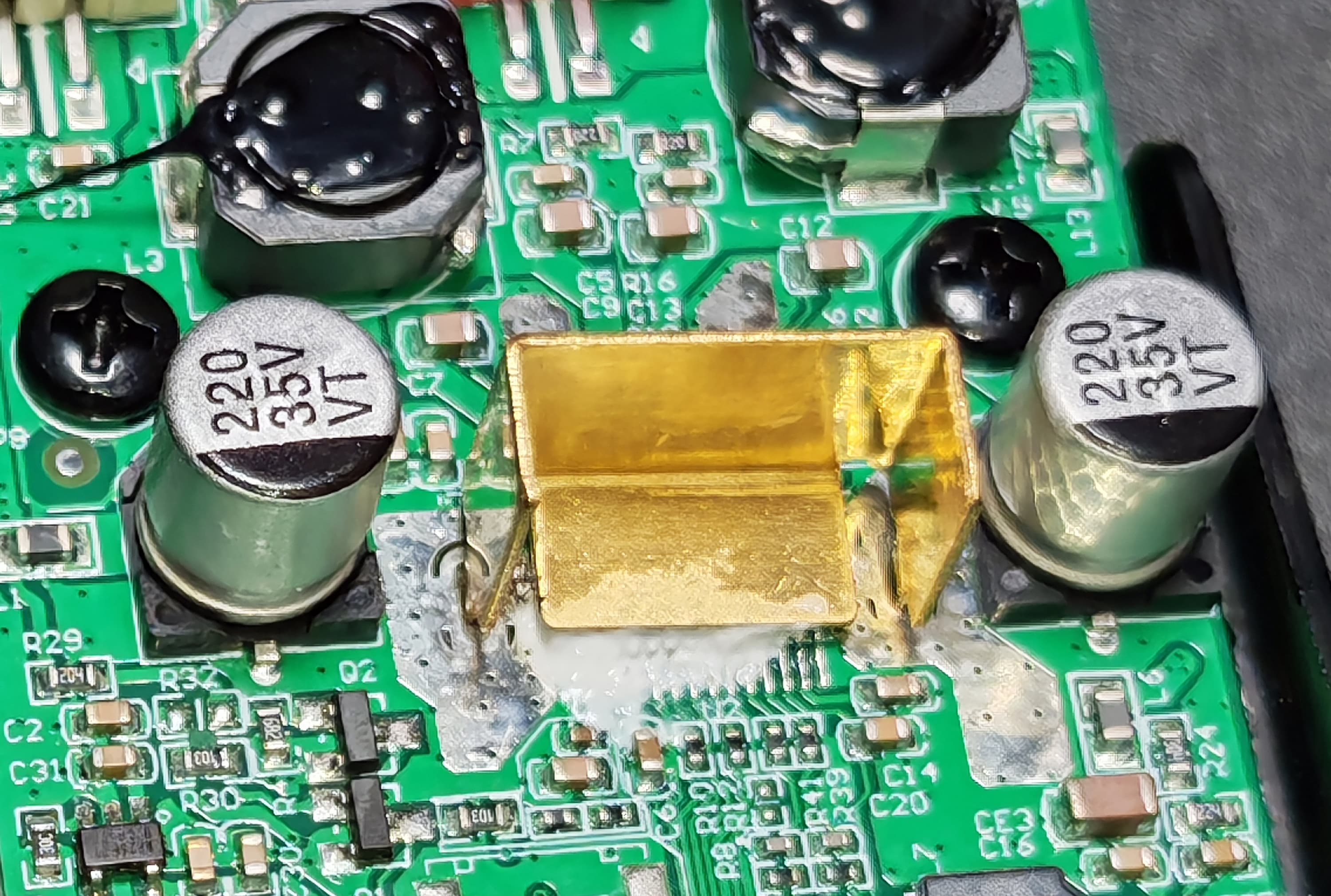 Радиатор распаян и дополнительно закреплен с помощью компаунда, его демонтаж затруднен и грозит повреждением компонентов в процессе, потому пришлось оставить его на месте.