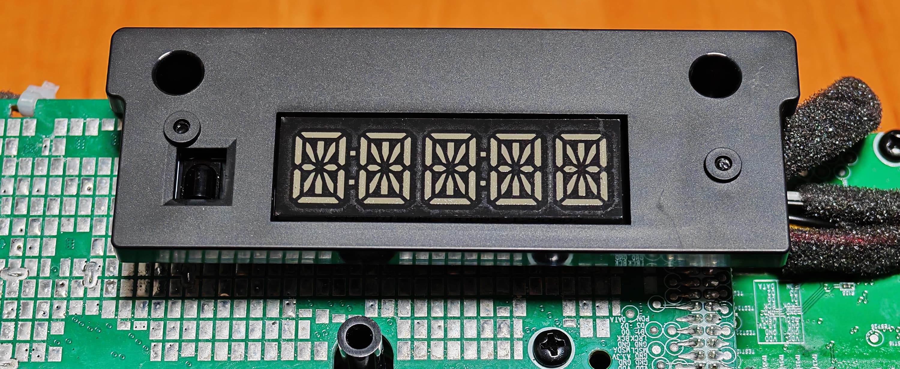 Как уже упоминалось выше, дисплей состоит из пяти индикаторов с 14 сегментами, а также двух разделителей в виде двоеточий. Слева находится окошко приемника ИК-сигнала от пульта дистанционного управления.