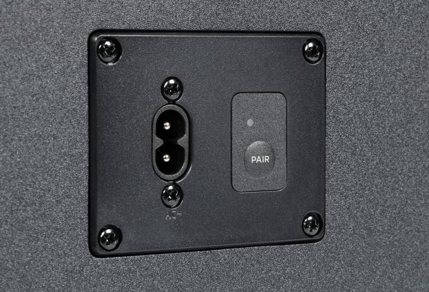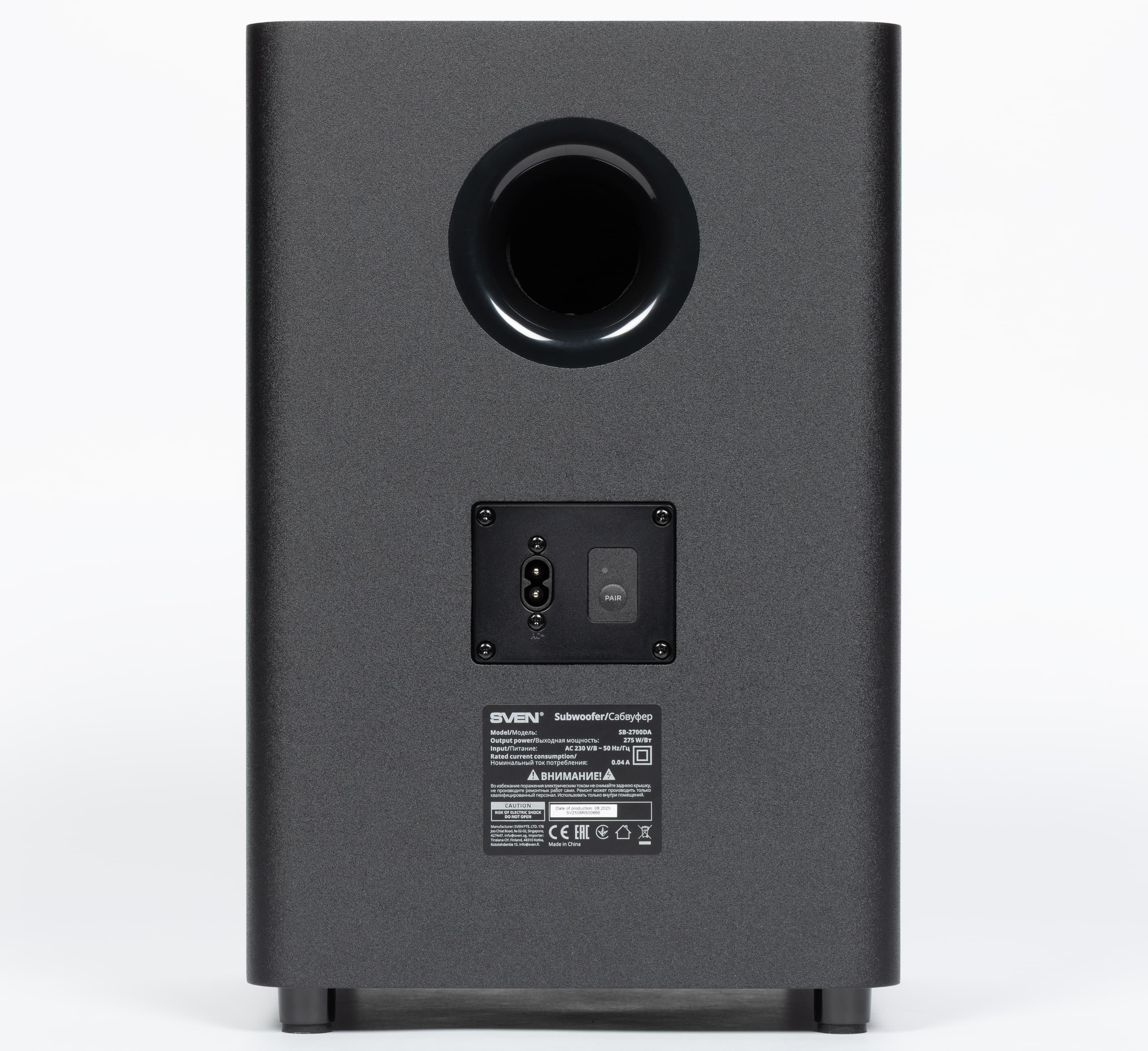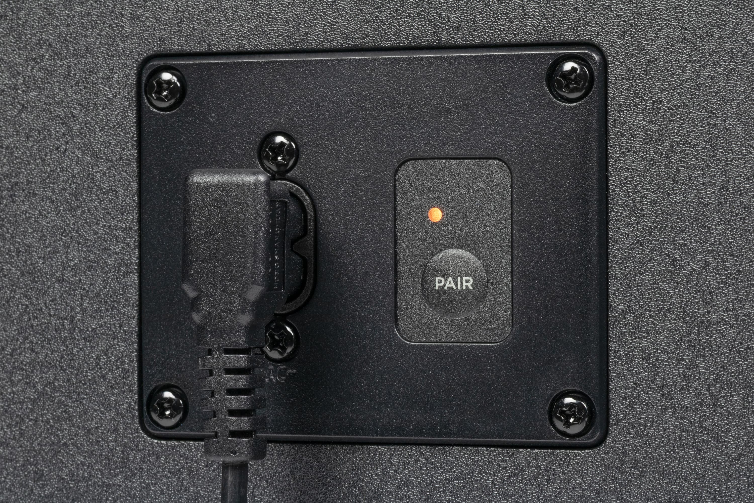 Сабвуфер не рекомендуется устанавливать в углах помещения или под мебелью — это может вызвать избыточные отражения и «гудение» на низких частотах. Оптимальное место можно подобрать путем проб и ошибок, беспроводное подключение обеспечивает большой простор для экспериментов с размещением. При первом включении саундбар и сабвуфер автоматически подключаются друг к другу, но при необходимости их можно вручную синхронизировать с помощью кнопки Pair на задней панели сабвуфера. Подробная инструкция по сопряжению приведена в руководстве пользователя.