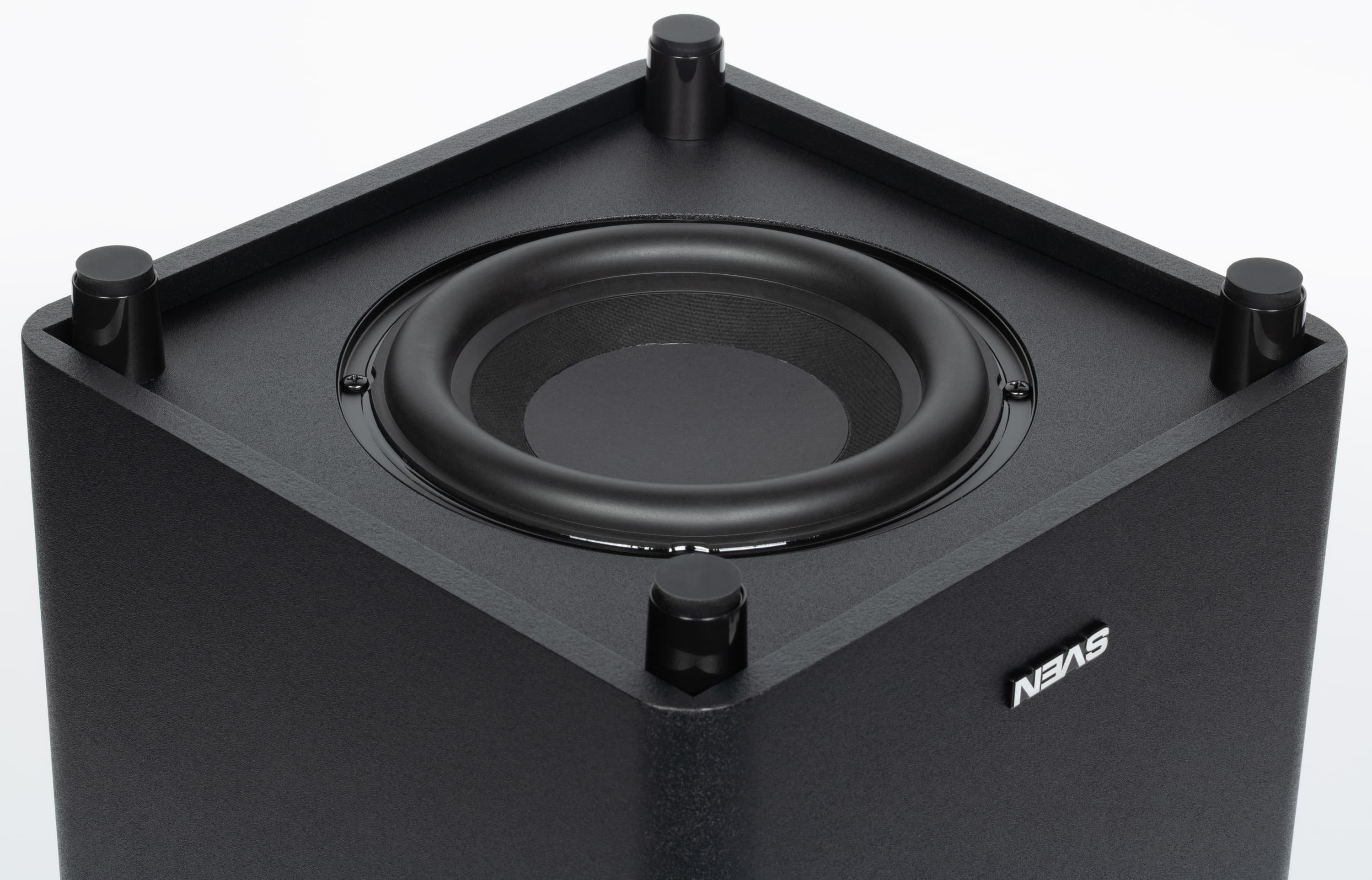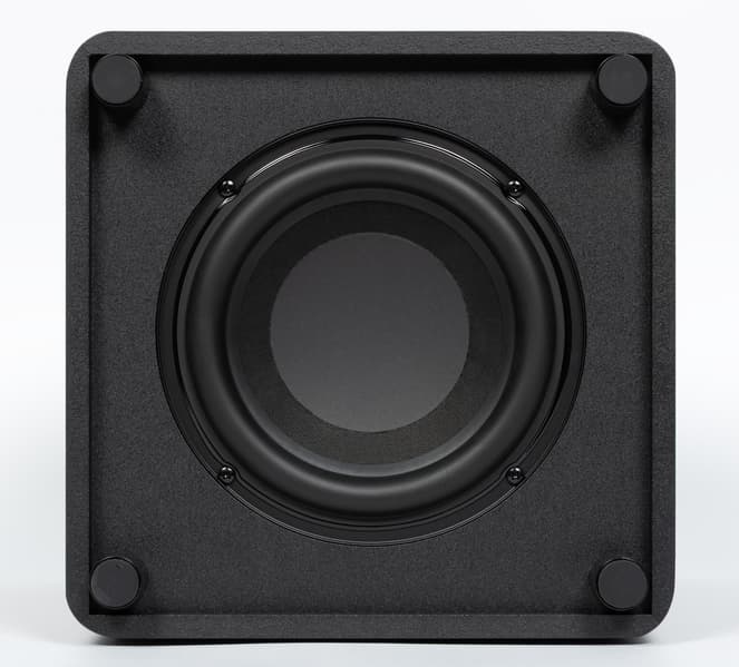 По периметру нижней стенки размещены ножки с резиновым основанием, способные не только обеспечивать устойчивое положение сабвуфера, но и поглощать небольшую часть нежелательных вибраций его корпуса при работе.