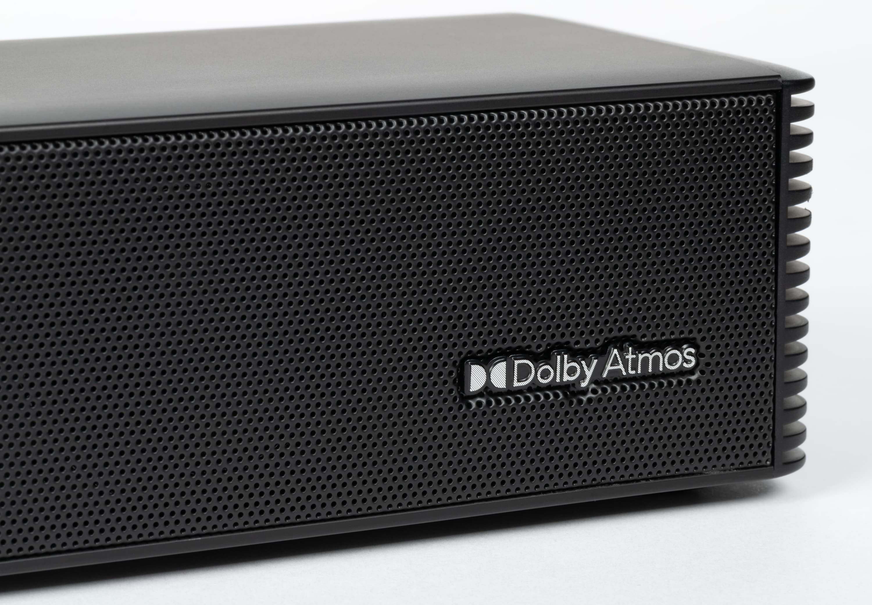 Слева на передней панели расположен логотип производителя с отделкой «под металл», справа — выполненный в той же манере значок Dolby Atmos.