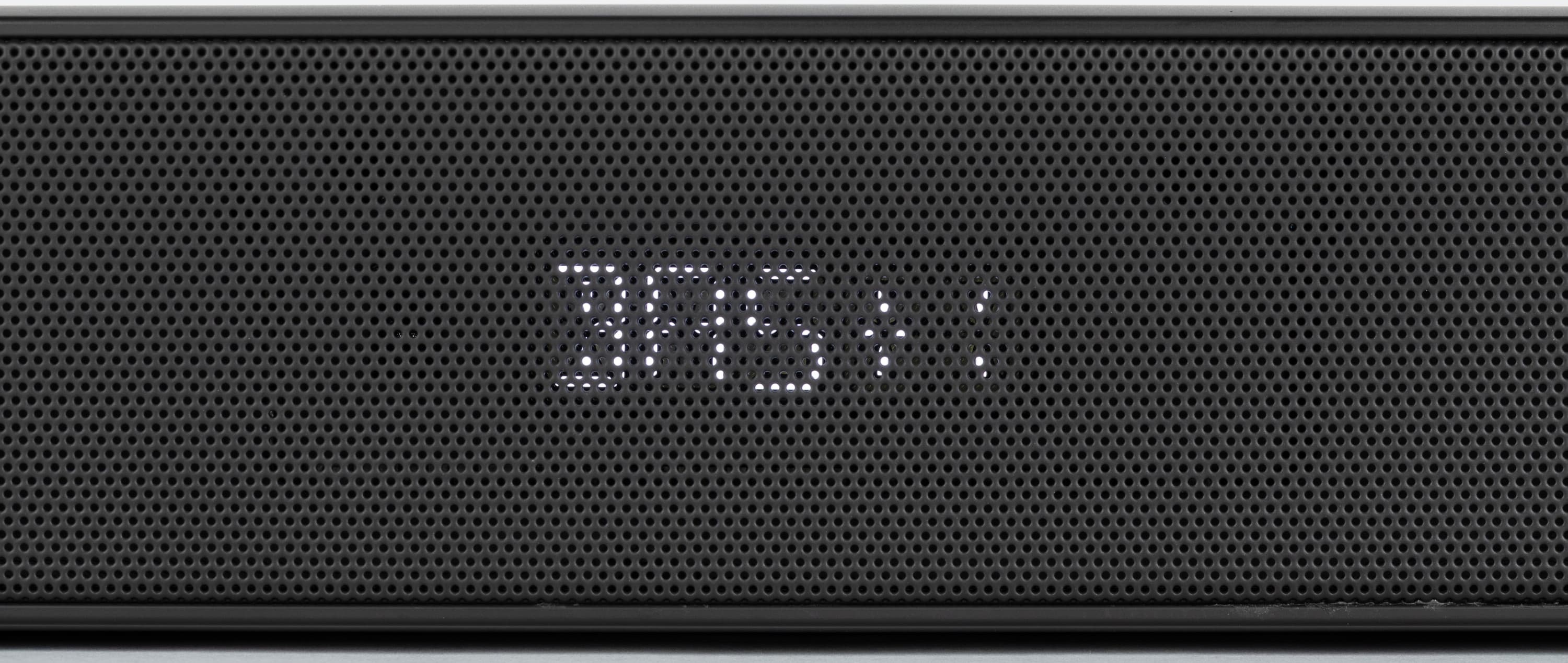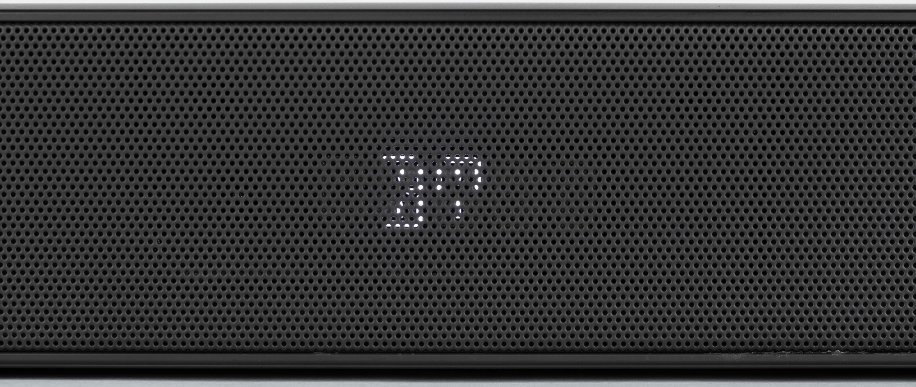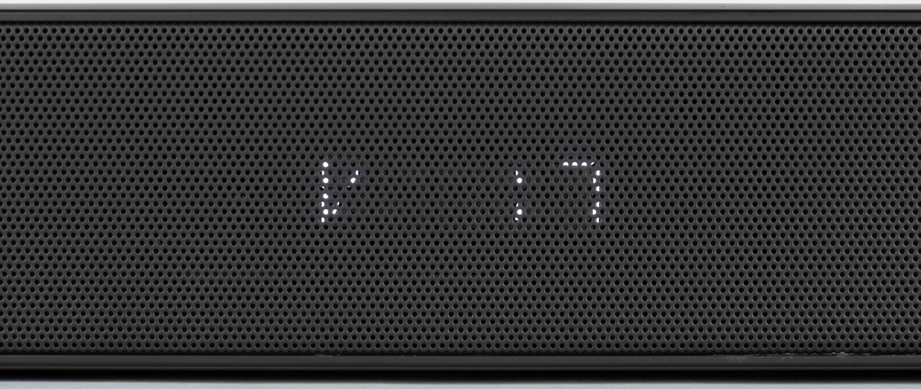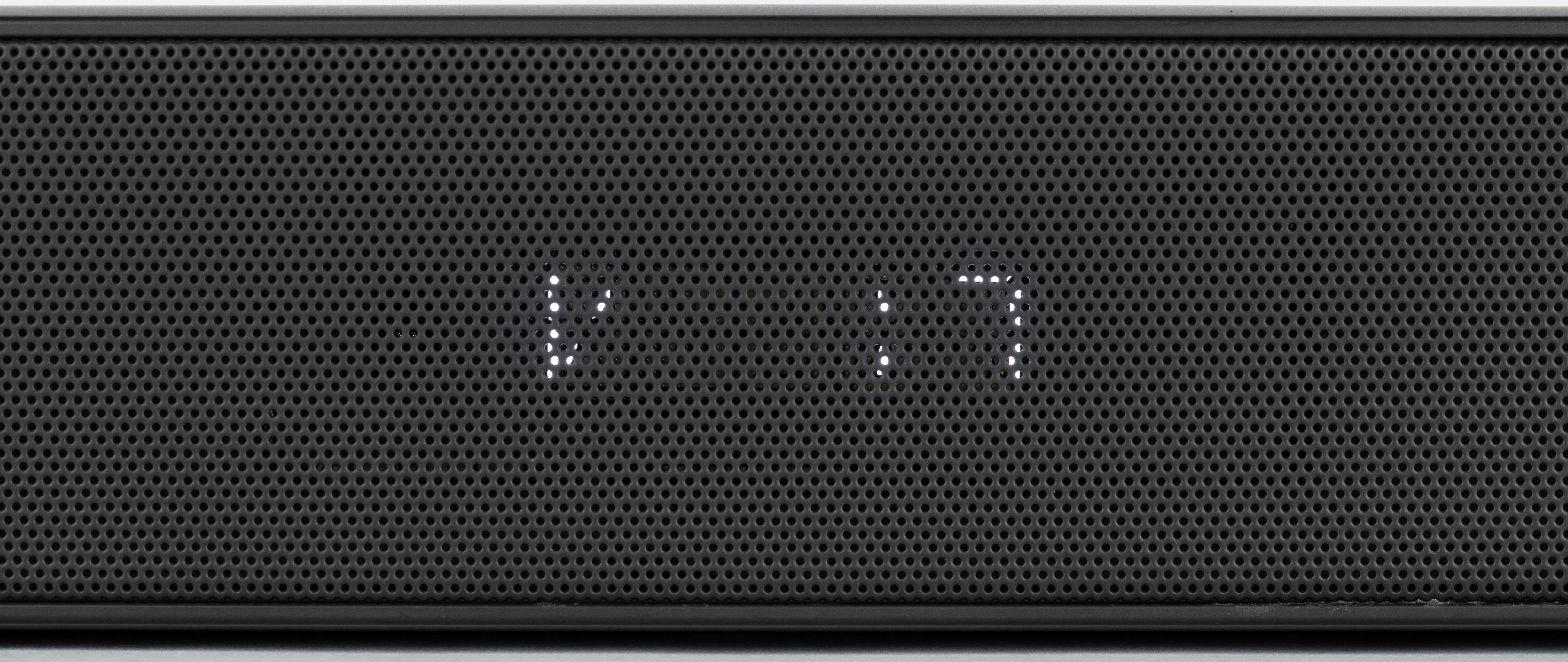 Саундбар довольно компактный: 1000×66×96 мм. При этом корпус заметно вытянут в длину, что логично — семь динамиков нужно где-то разместить. Заодно фронтальные можно развести чуть дальше друг от друга, что положительно сказывается на стереоэффекте. Передняя панель полностью закрыта металлической сеткой, за которой расположен дисплей из пяти индикаторов с 14 сегментами — побольше, чем у упомянутых во введении бюджетных моделей. Во время работы саундбара дисплей автоматически отключается и не отвлекает от просмотра ТВ.