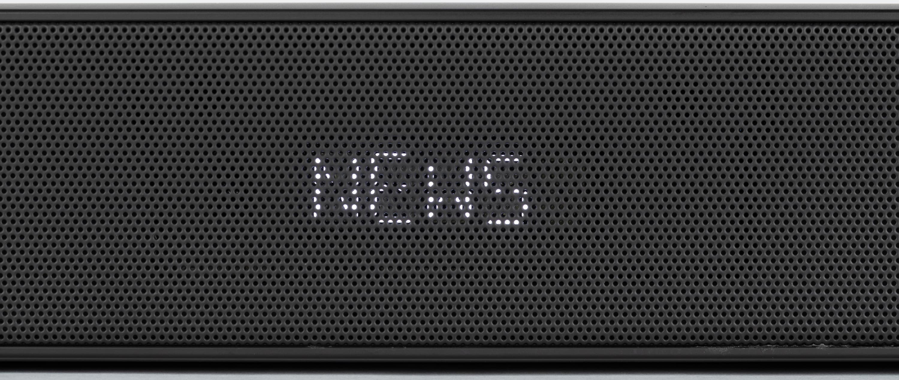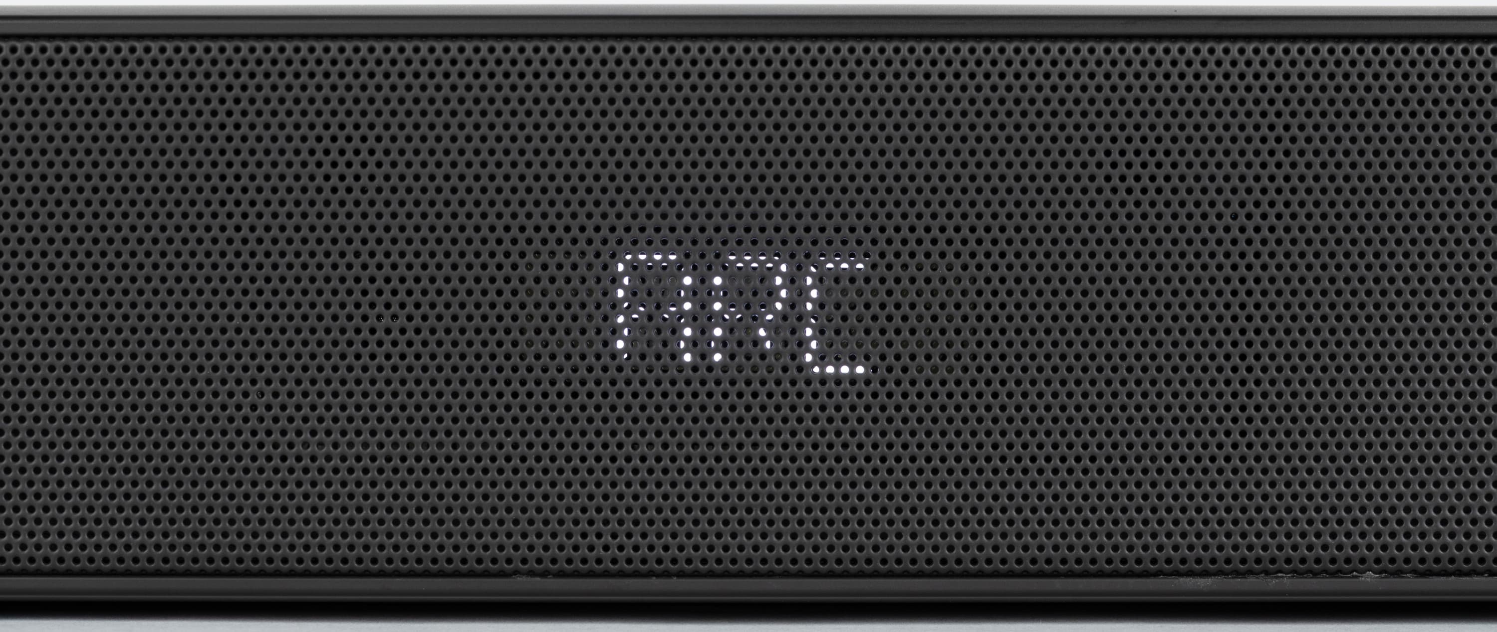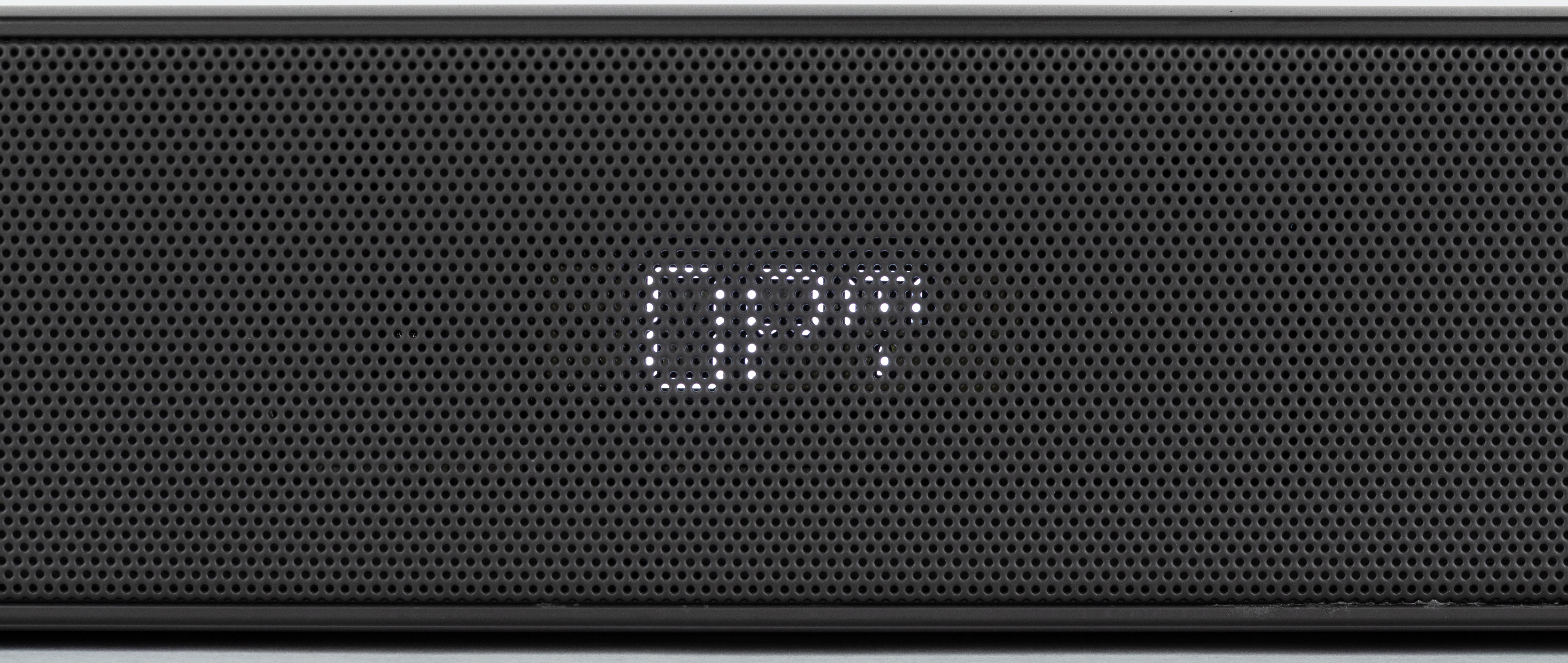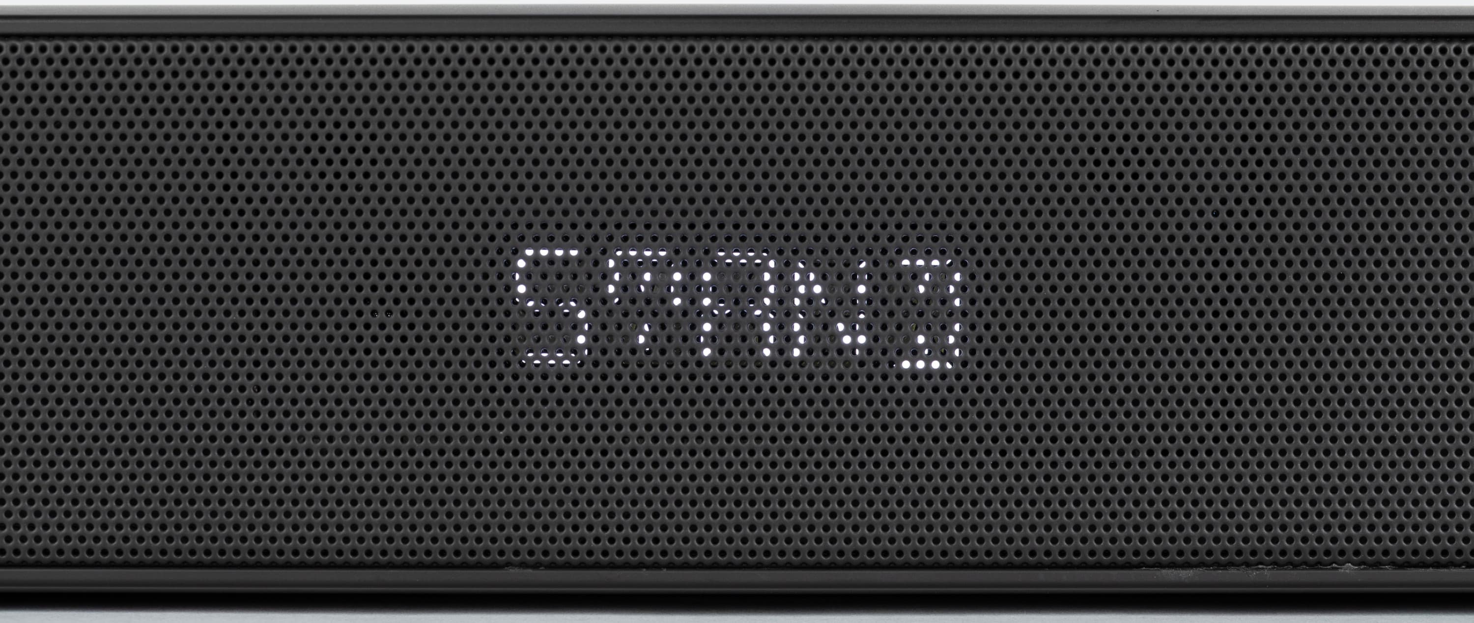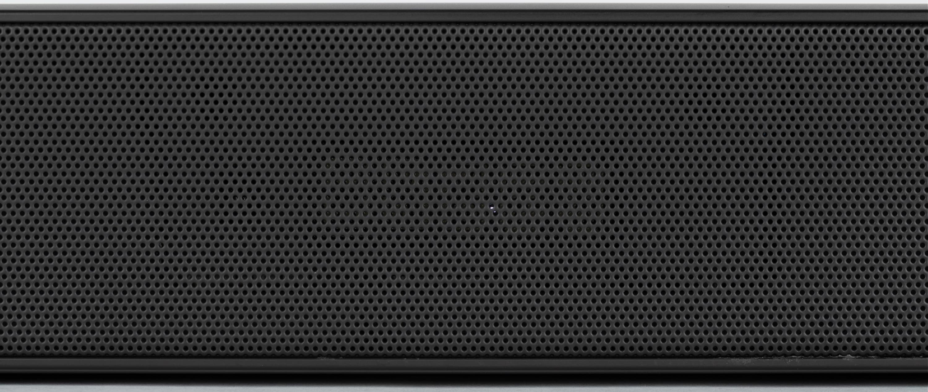 Саундбар довольно компактный: 1000×66×96 мм. При этом корпус заметно вытянут в длину, что логично — семь динамиков нужно где-то разместить. Заодно фронтальные можно развести чуть дальше друг от друга, что положительно сказывается на стереоэффекте. Передняя панель полностью закрыта металлической сеткой, за которой расположен дисплей из пяти индикаторов с 14 сегментами — побольше, чем у упомянутых во введении бюджетных моделей. Во время работы саундбара дисплей автоматически отключается и не отвлекает от просмотра ТВ.