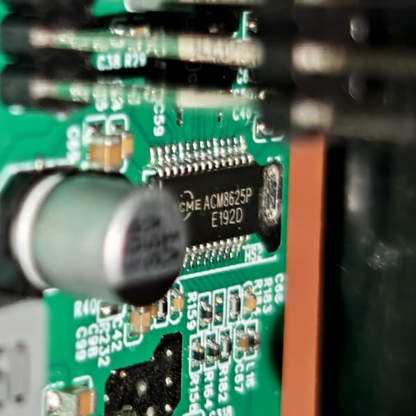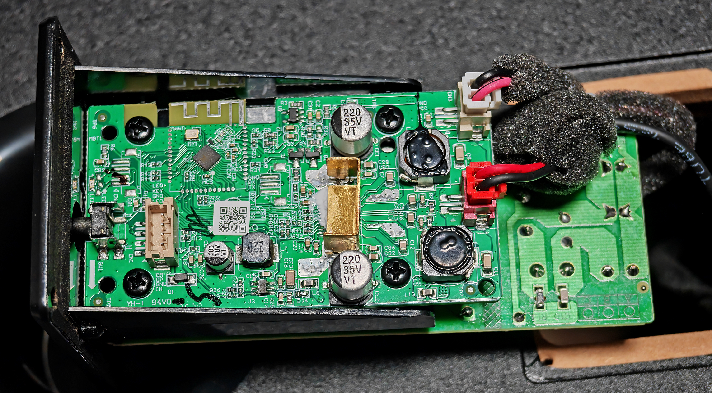 Усиление построено на четырех усилителях класса D с цифровым входом Acme ACM8625P, способных выдавать 2×33 Вт в стереорежиме.