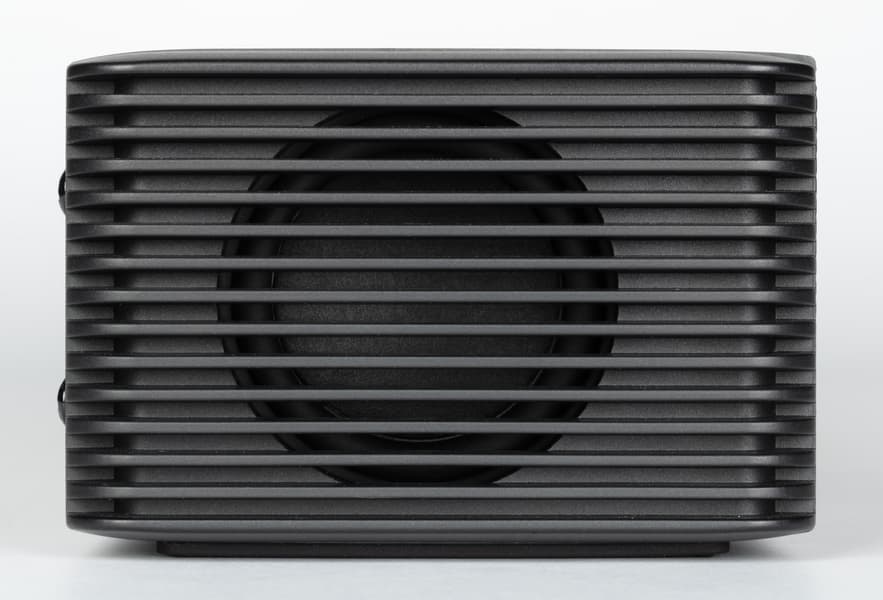 На передней стенке корпуса размещен логотип производителя — единственный декоративный элемент. Сзади находятся порт фазоинвертора, разъем для подключения сетевого кабеля, кнопка активации сопряжения и наклейка с технической информацией.