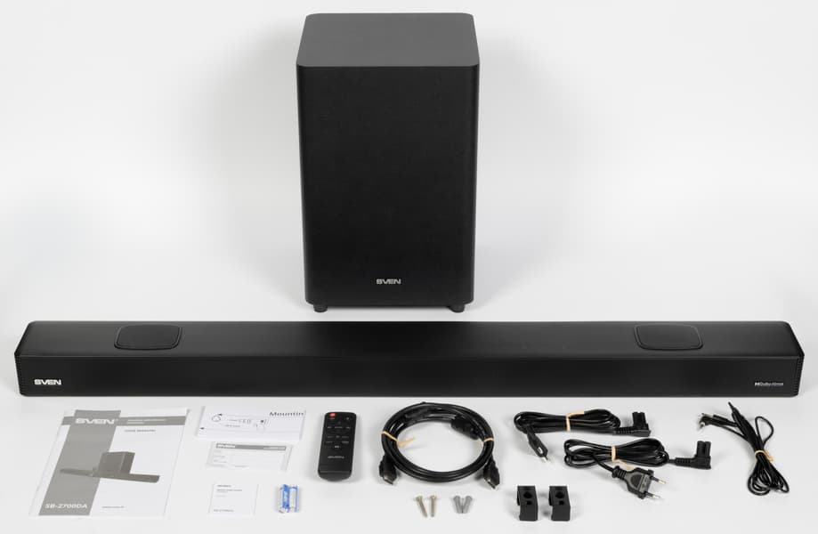 В комплект поставки входят саундбар и беспроводной сабвуфер, пульт дистанционного управления и две батарейки типа АА к нему, кабель HDMI, аудиокабель для аналогового подключения, два кабеля питания, набор для настенного крепления и монтажный шаблон, а также документация.