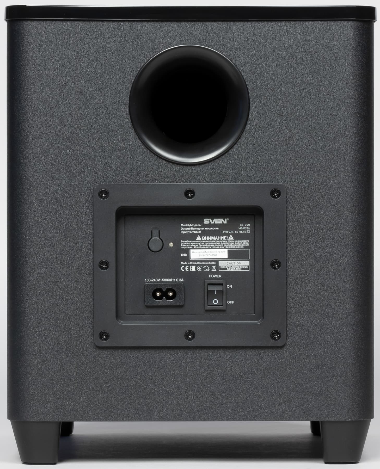 На задней панели расположились отверстие фазоинвертора, разъем питания, клавиша включения, а также индикатор и кнопка сброса беспроводного подключения к центральному устройству.