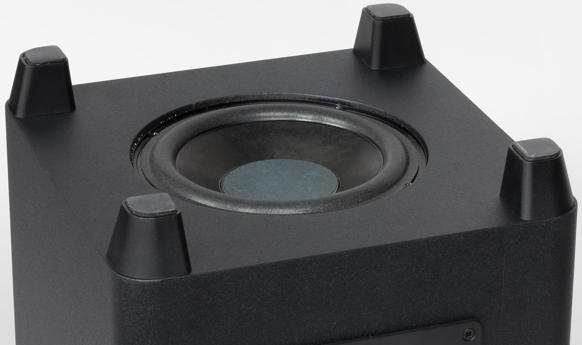 Покрытие верхней части по текстуре напоминает металл со следами шлифовки. Выглядит отлично, а вот при проведении по нему рукой вызывает спорные ощущения. К счастью, водить по сабвуферу рукой в ходе эксплуатации совершенно необязательно.