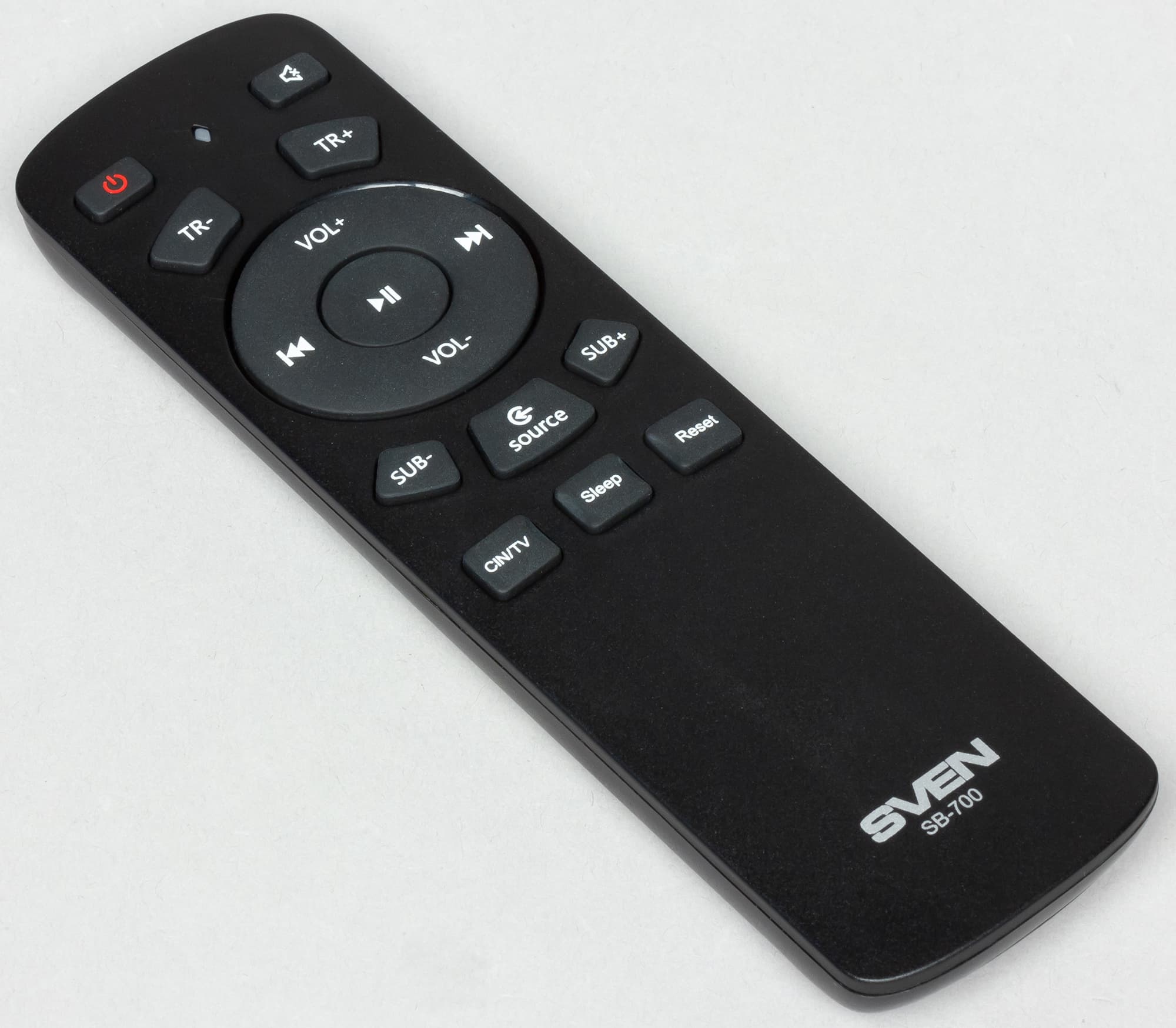 Пульт дистанционного управления Sven SB-700 выполнен из приятного на ощупь пластика, кнопки нажимаются с отчетливым кликом. Чувствительность ИК-датчика достаточно высока, пульт хорошо срабатывает из различных положений относительно саундбара. С его помощью можно включать и выключать устройство, управлять громкостью и эквалайзером, выбирать источники сигнала, переключать режимы воспроизведения, устанавливать таймер отключения и сбрасывать настройки до состояния по умолчанию. При воспроизведении с подключением по Bluetooth и с USB-накопителя добавляется возможность переключать треки.