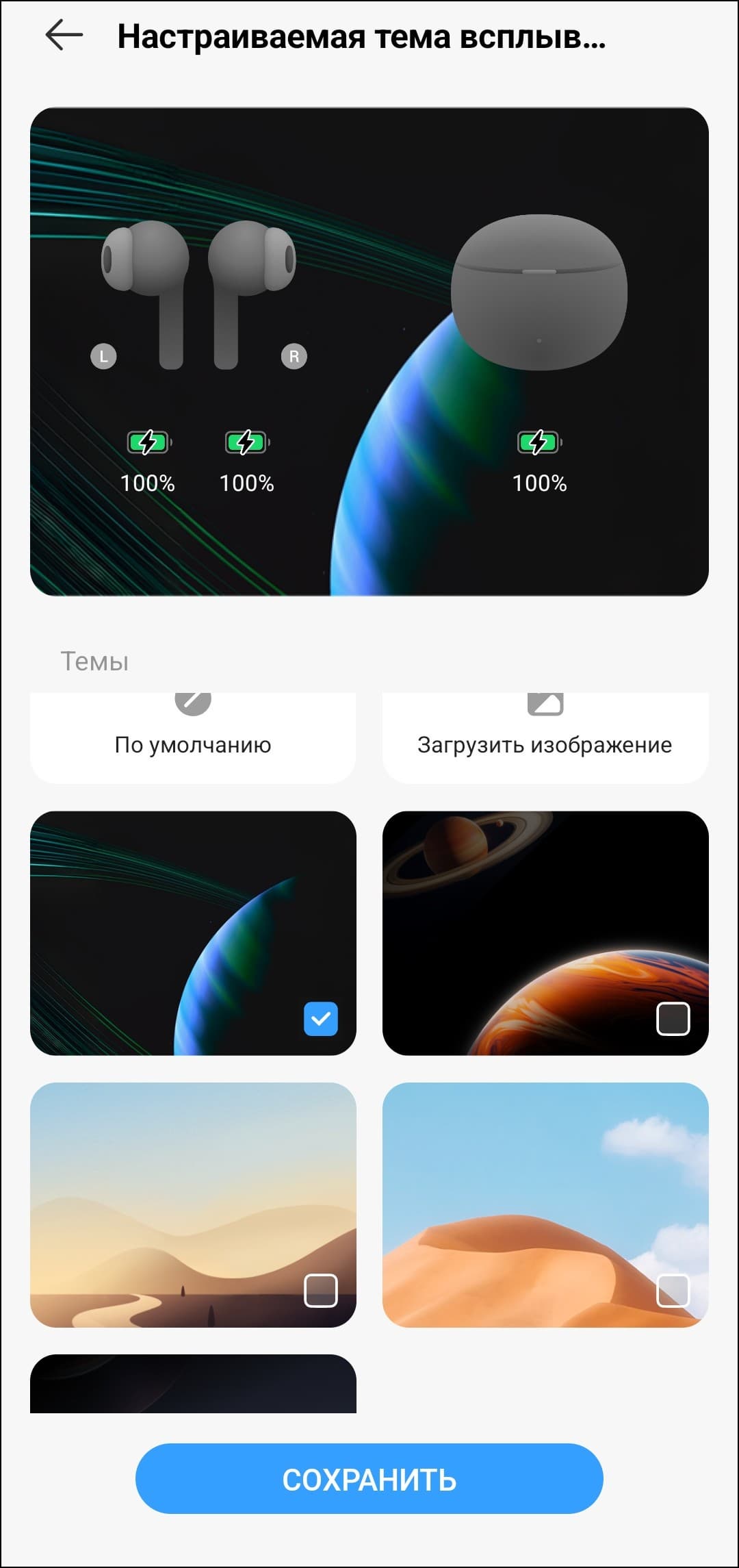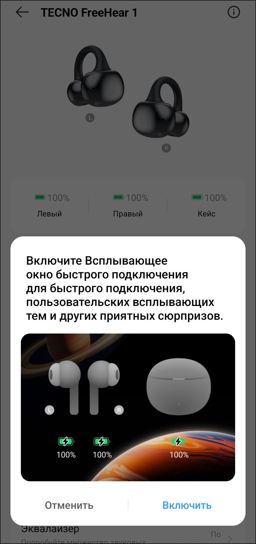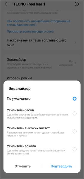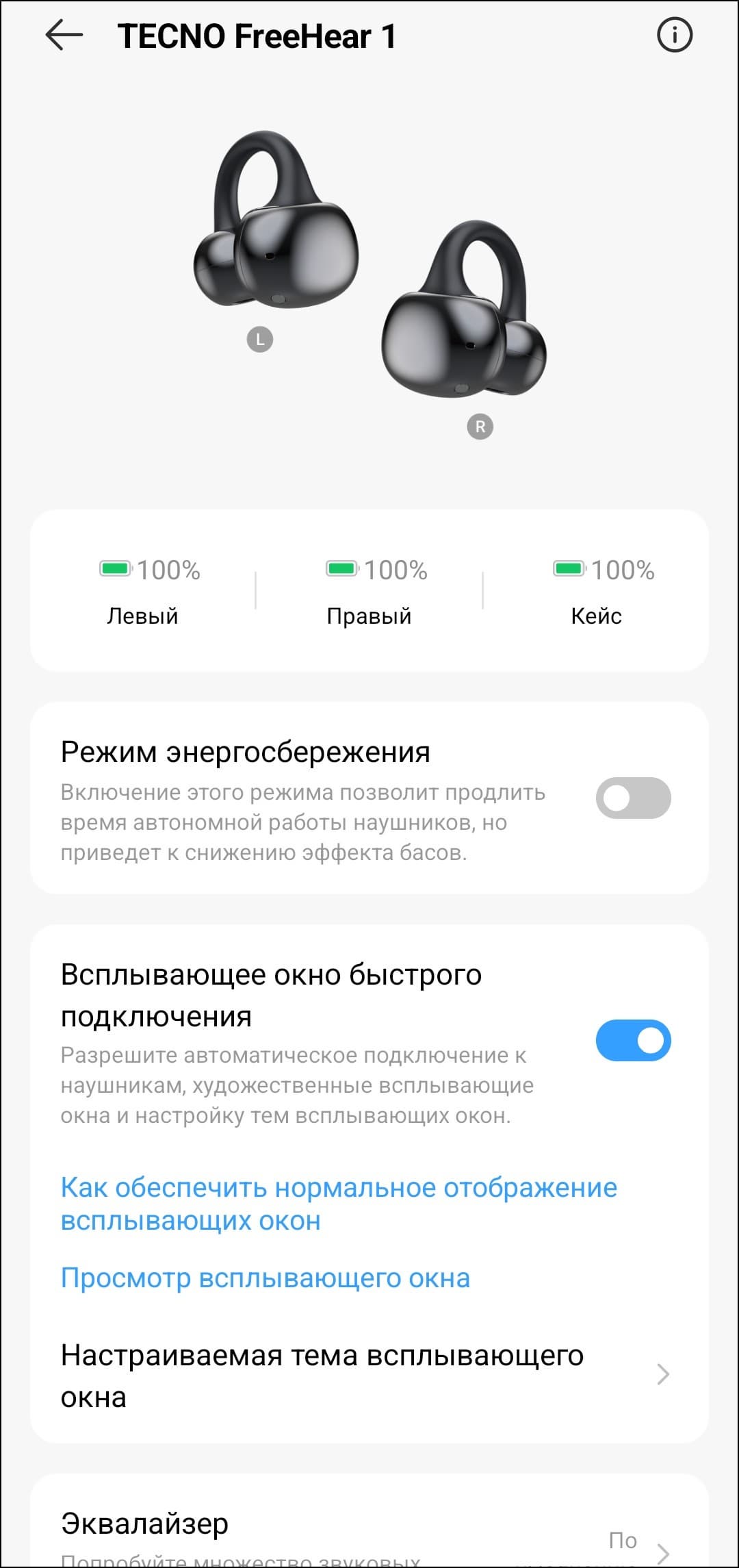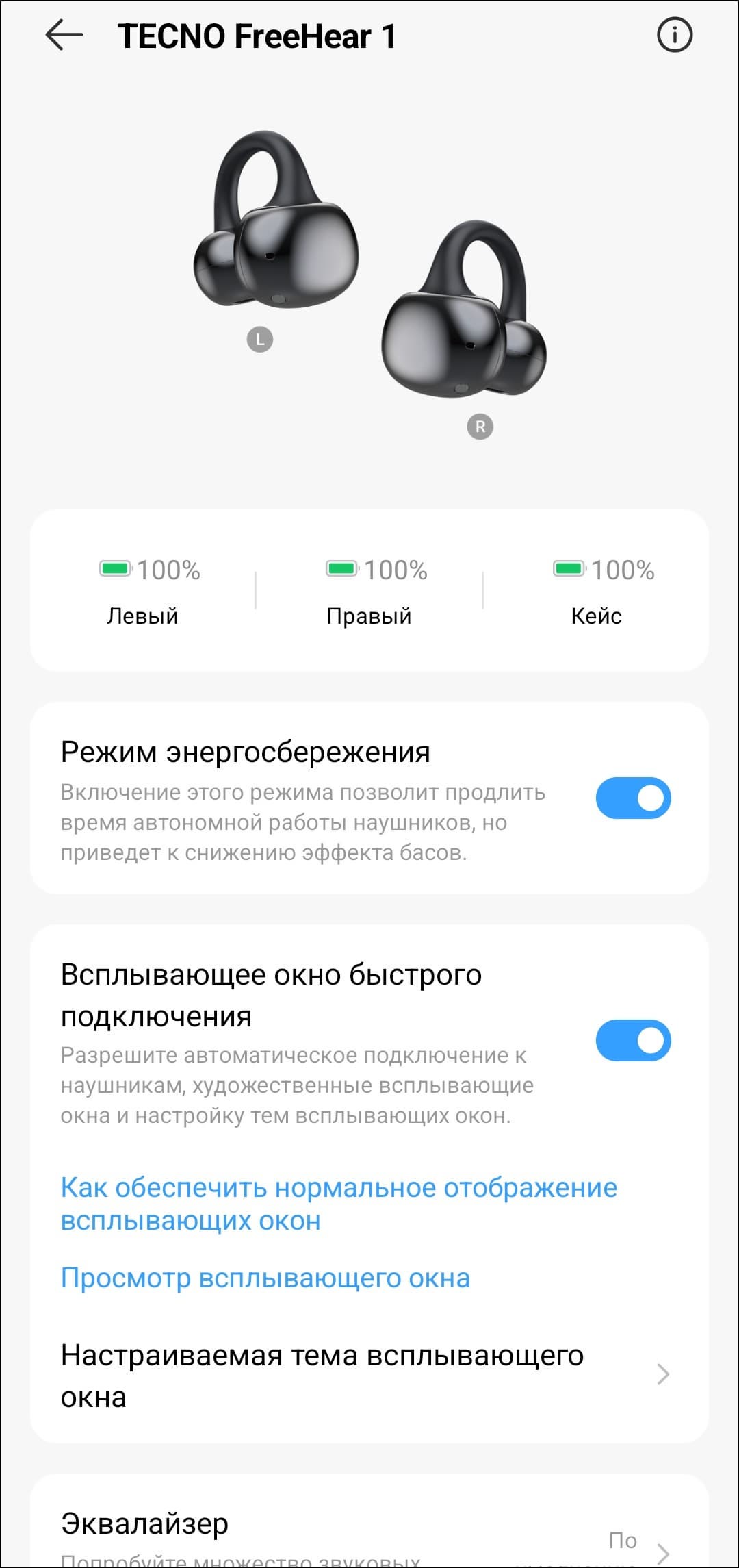 На главном экране устройства доступен «режим энергосбережения», который позволяет немного продлить время работы наушников — правда, за счет заметного снижения выразительности басов. Чуть ниже можно отключить всплывающее окно при подключении или изменить его оформление: предусмотрено несколько вариантов фона на выбор. Как и в других знакомых нам наушниках-каффах, эквалайзер здесь представлен всего четырьмя предустановками.