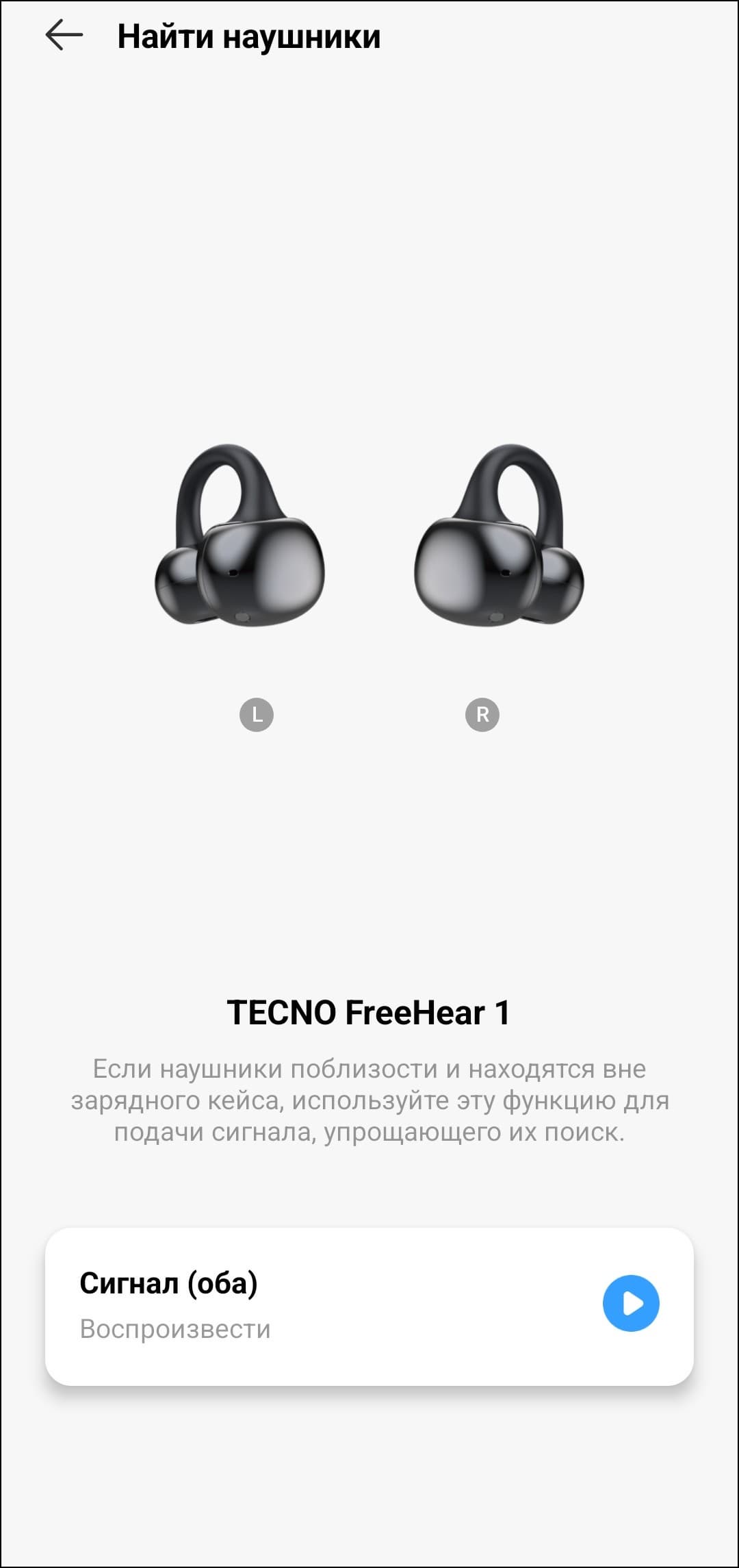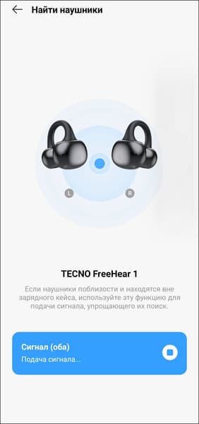 В протестированных нам ранее наушниках-каффах управление назвалось сенсорным, но по факту за регистрацию постукиваний по корпусу отвечали микрофоны. Это позволяло прикасаться к любой части наушников: хоть к «фасолине», хоть к округлой части с динамиком, хоть к перемычке — все замечательно работало. А вот у Tecno FreeHear 1 используется именно сенсор, размещенный на внешней поверхности фасолевидного элемента. Соответственно, прикасаться надо только к ней — других вариантов не предусмотрено. Касания регистрируются корректно, в том числе — многократные. Правда, требуемая задержка между повторными тапами чуть выше средней, торопиться тут не надо. К этой особенности придется немного привыкнуть. Обо всем происходящем с ними наушники информируют пользователя с помощью голосовых сообщений на английском языке.