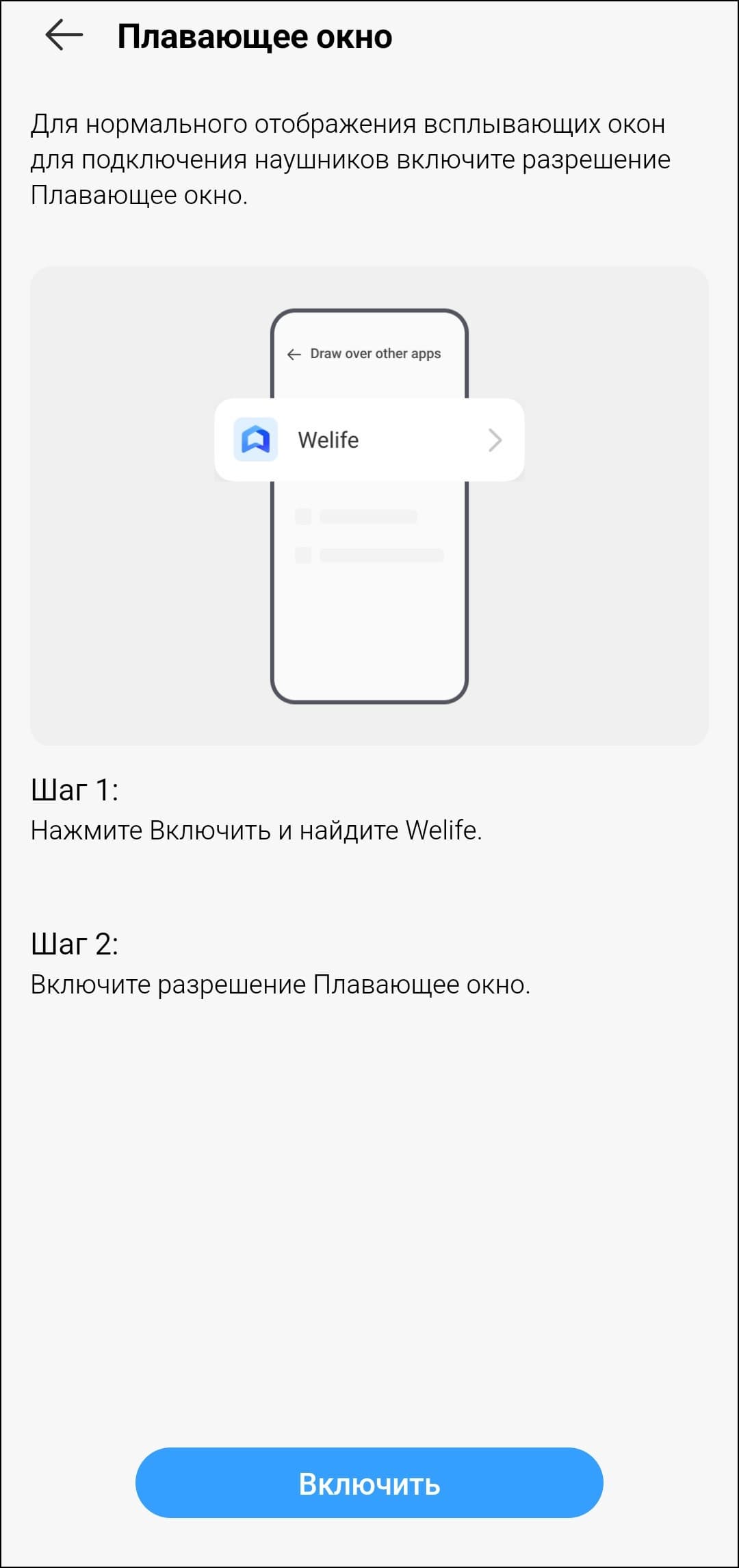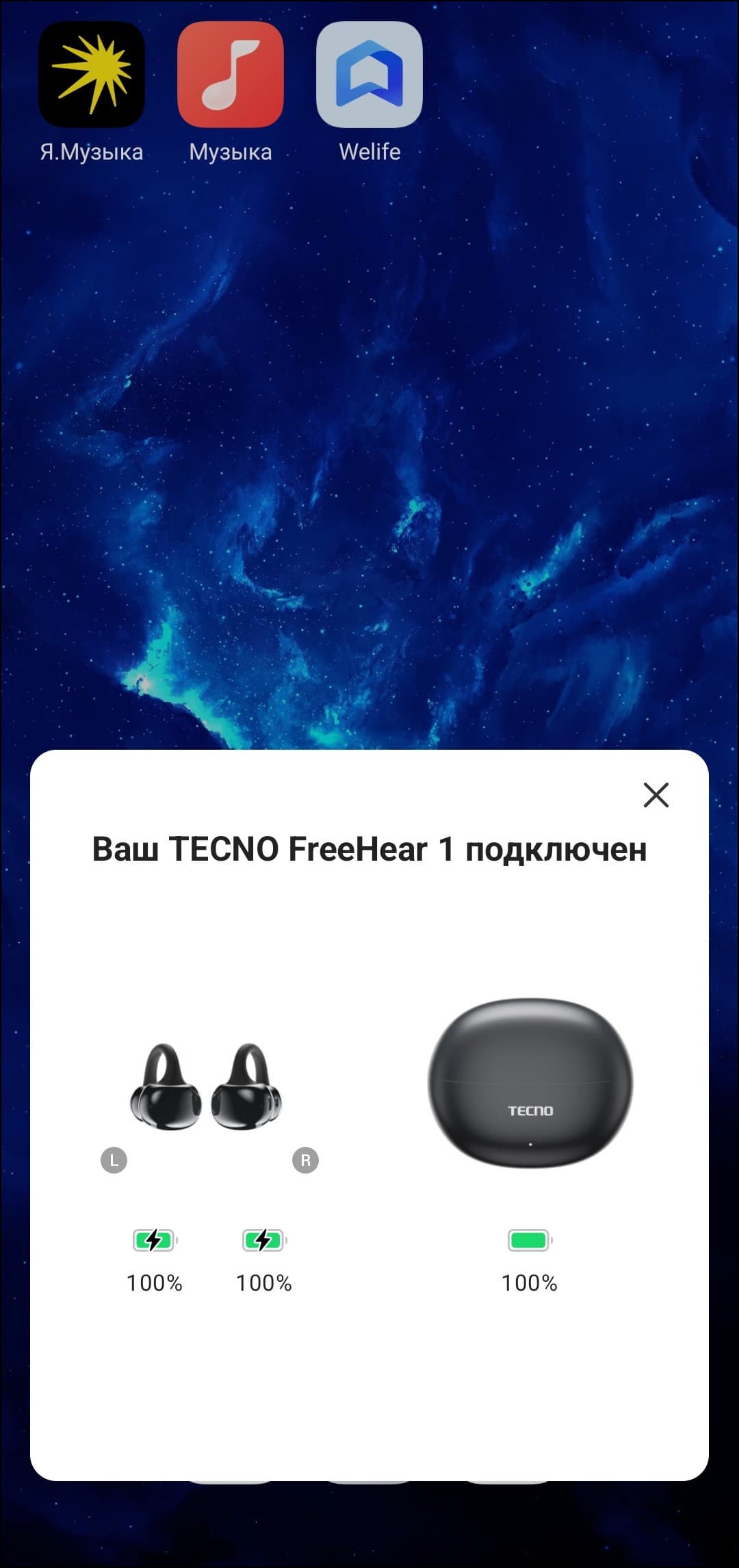 Настройка гарнитуры осуществляется через фирменное приложение Welife, которое доступно только для устройств на Android. Загрузить его можно как из Google Play, так и из RuStore. После установки приложение предлагает разрешить показ всплывающих окон при подключении наушников и выдать все необходимые разрешения. После включения функция работает как надо: окна появляются с приемлемой задержкой и информируют пользователя об уровне заряда наушников и кейса.