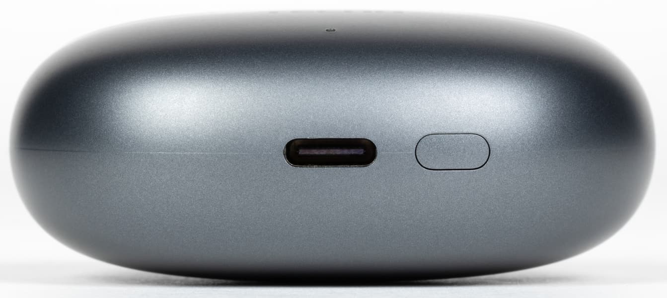 На дне кейса находятся порт USB Type C и кнопка активации режима сопряжения с гаджетом-источником звука. Нажимается она с заметным усилием и размещена заподлицо с поверхностью корпуса, что защищает ее от случайных срабатываний.