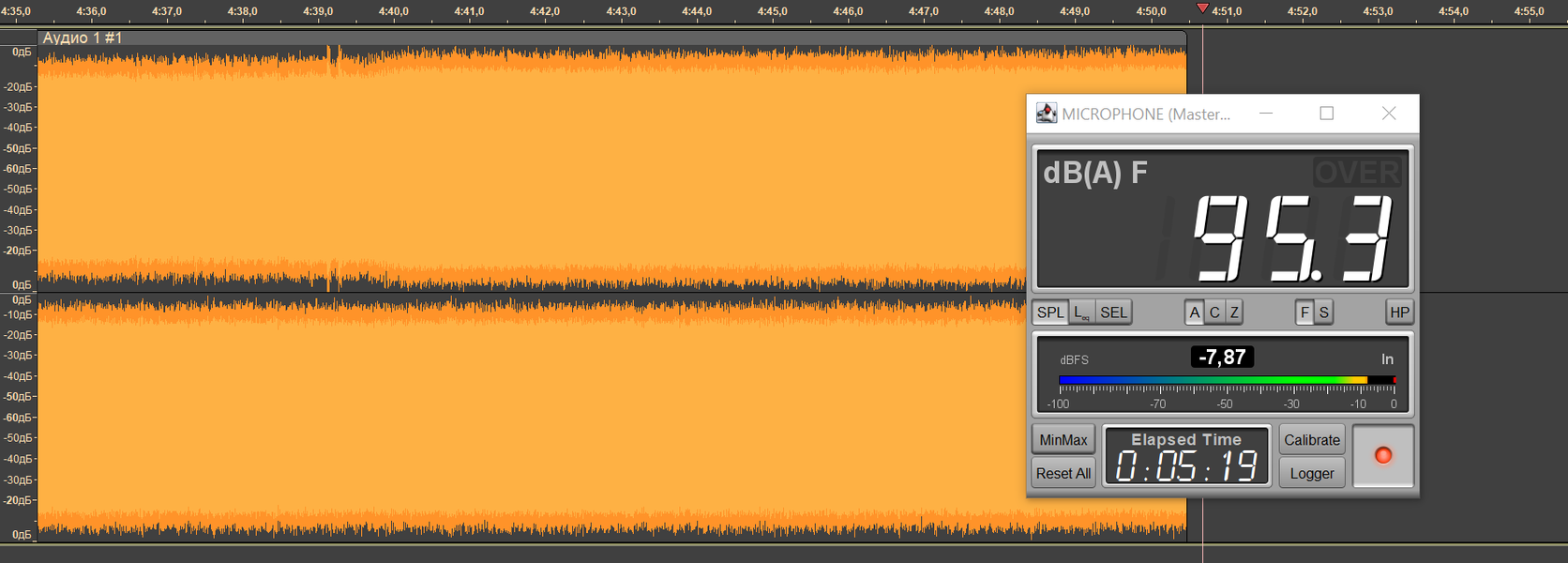 Посмотрим, как справится со своей задачей шумоподавление. Для этого снова запишем пару треков, но добавим фоновый шум: включим в расположенной недалеко от места записи акустике звук оживленной улицы и посмотрим, как это отразится на разборчивости речи.