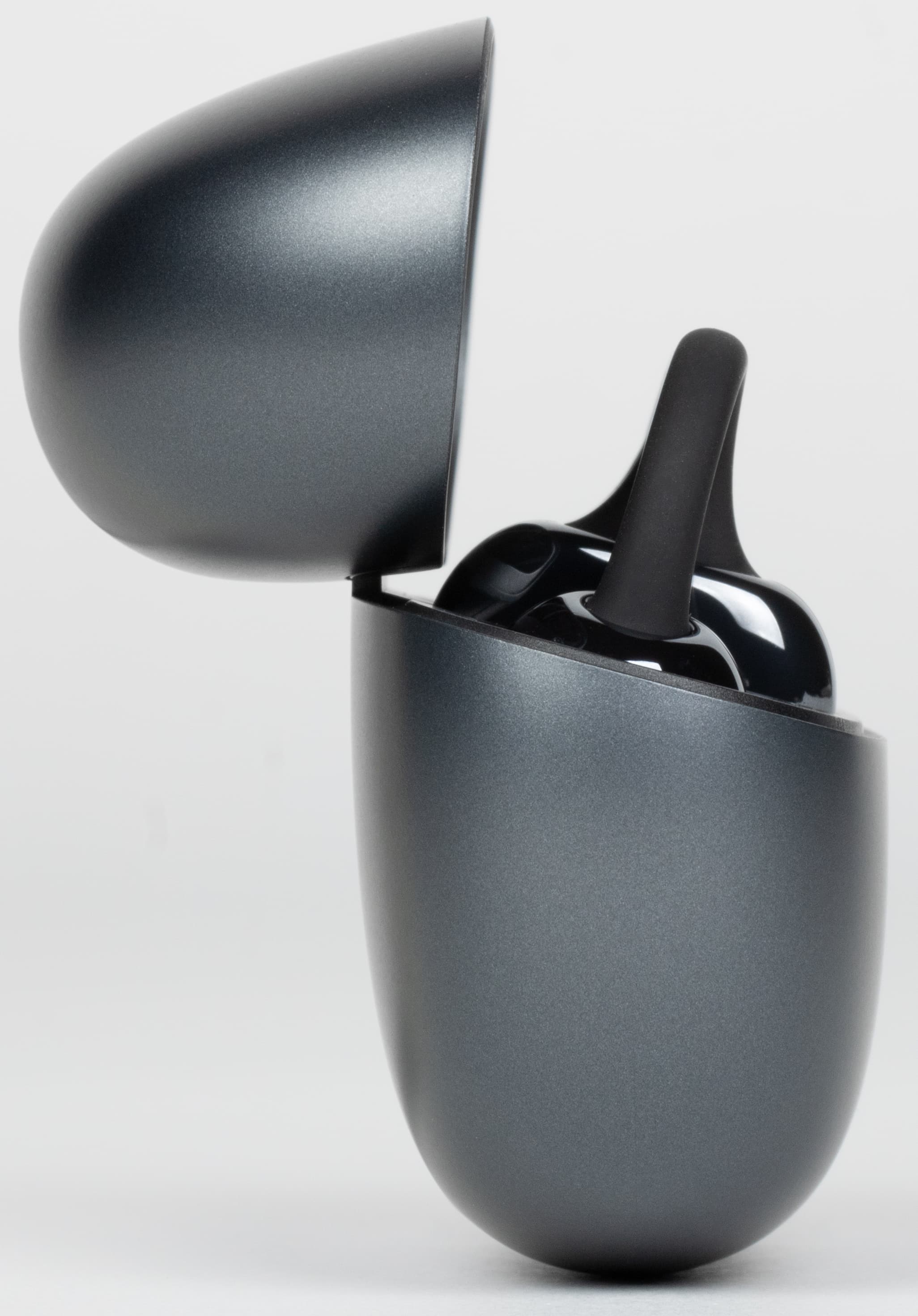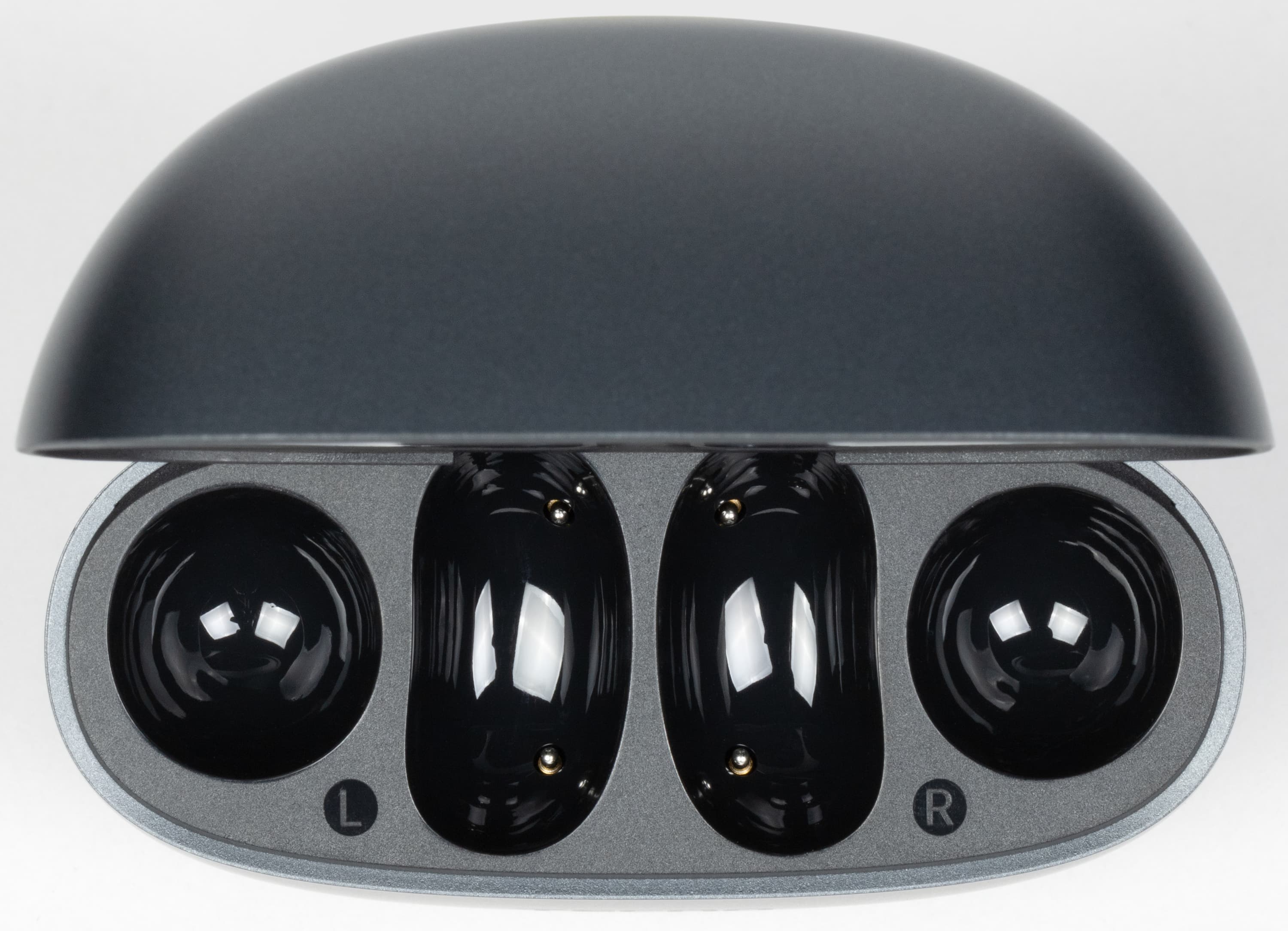 Наушники удерживаются на своих местах за счет магнитов — при открытии крышки они остаются в слотах и не выпадают. Во внутренней части посадочных гнезд расположены подпружиненные контакты для зарядки.