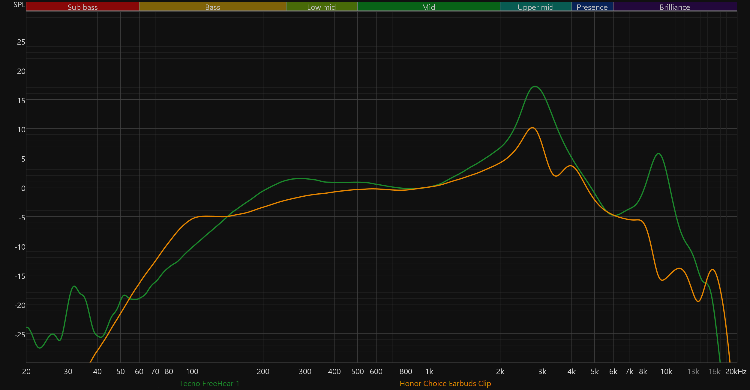 Сравним звучание Tecno FreeHear 1 с уже знакомыми нам более дорогими наушниками-каффами. Хорошо заметно, что с ростом цены значительно расширяются и возможности гарнитур в воспроизведении баса.