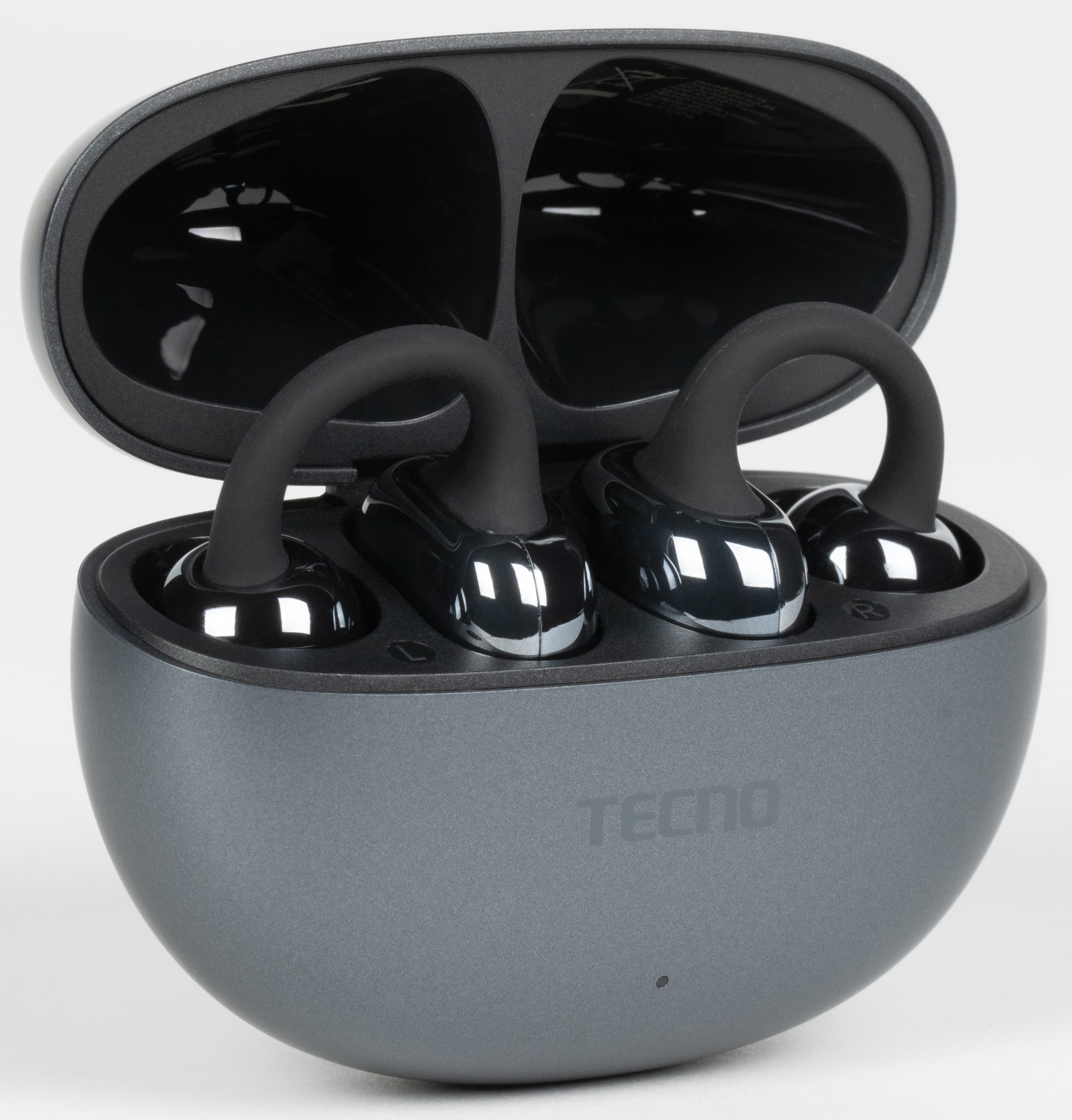 Форма наушников в целом повторяет ту, что мы уже видели у других моделей: фасолевидный опорный элемент, шарообразная часть с динамиком внутри и эластичный коннектор в виде арки. Но как известно, в эргономике решающую роль могут играть даже самые незначительные детали. Поэтому стоит отметить, что у Tecno FreeHear 1 фасолевидный элемент чуть более округлый, а предназначенная для опоры на заднюю часть ушной раковины выемка в нем выражена слабее.