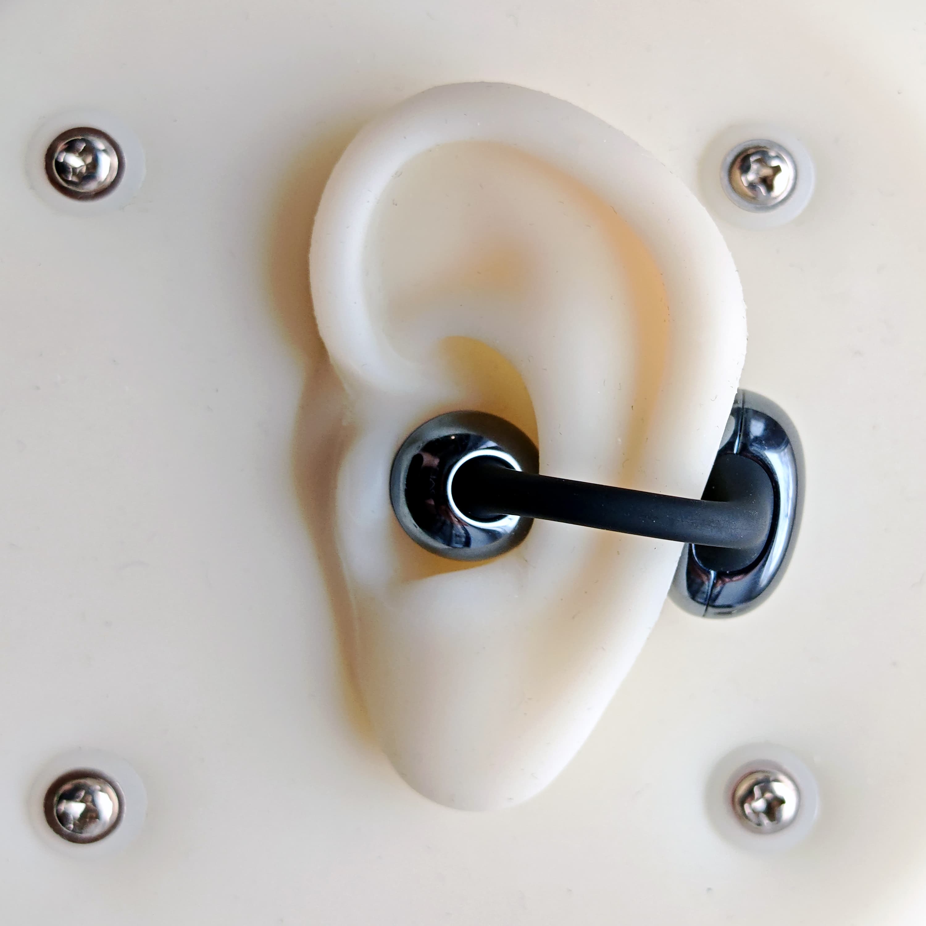 Для измерения АЧХ мы используем стенд с моделью ушной раковины, что позволяет разместить наушники относительно имитированного слухового прохода так же, как это происходит при реальном ношении.