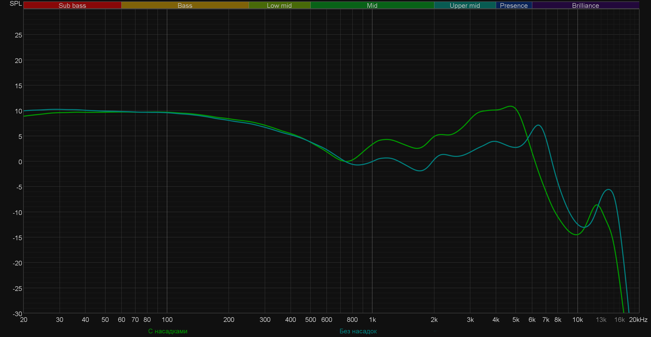 Ну а мы тем временем снимаем силиконовые насадки. И неожиданно получаем не ожидаемое ослабление акцента на басе, а заметный провал в ВЧ-диапазоне. При этом на слух звучание кажется гораздо более сбалансированным, чем может показаться по графику — особенно если чуть ослабить крепление наушников ради большего комфорта.