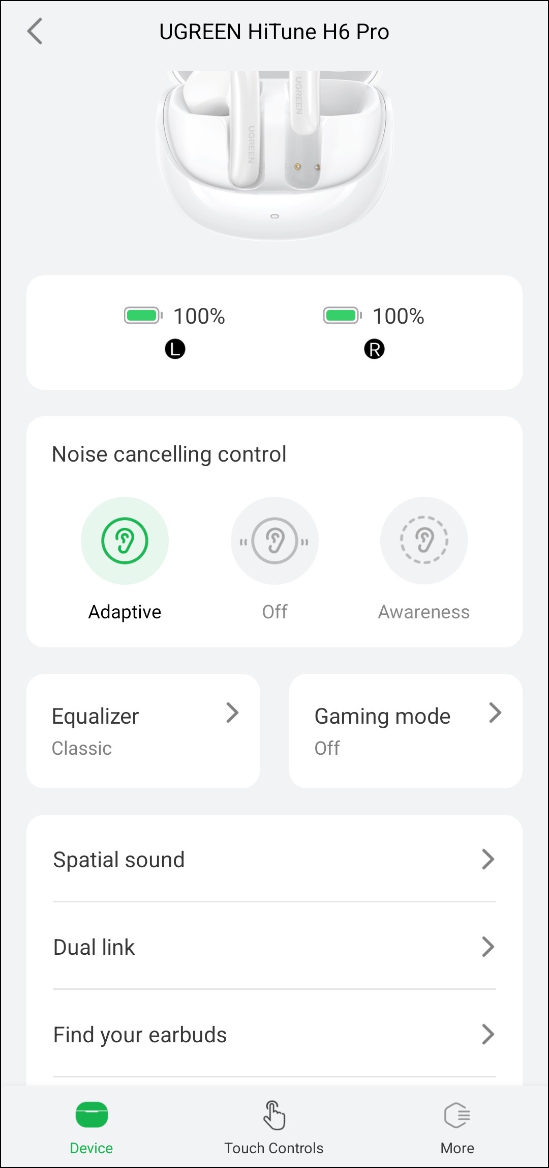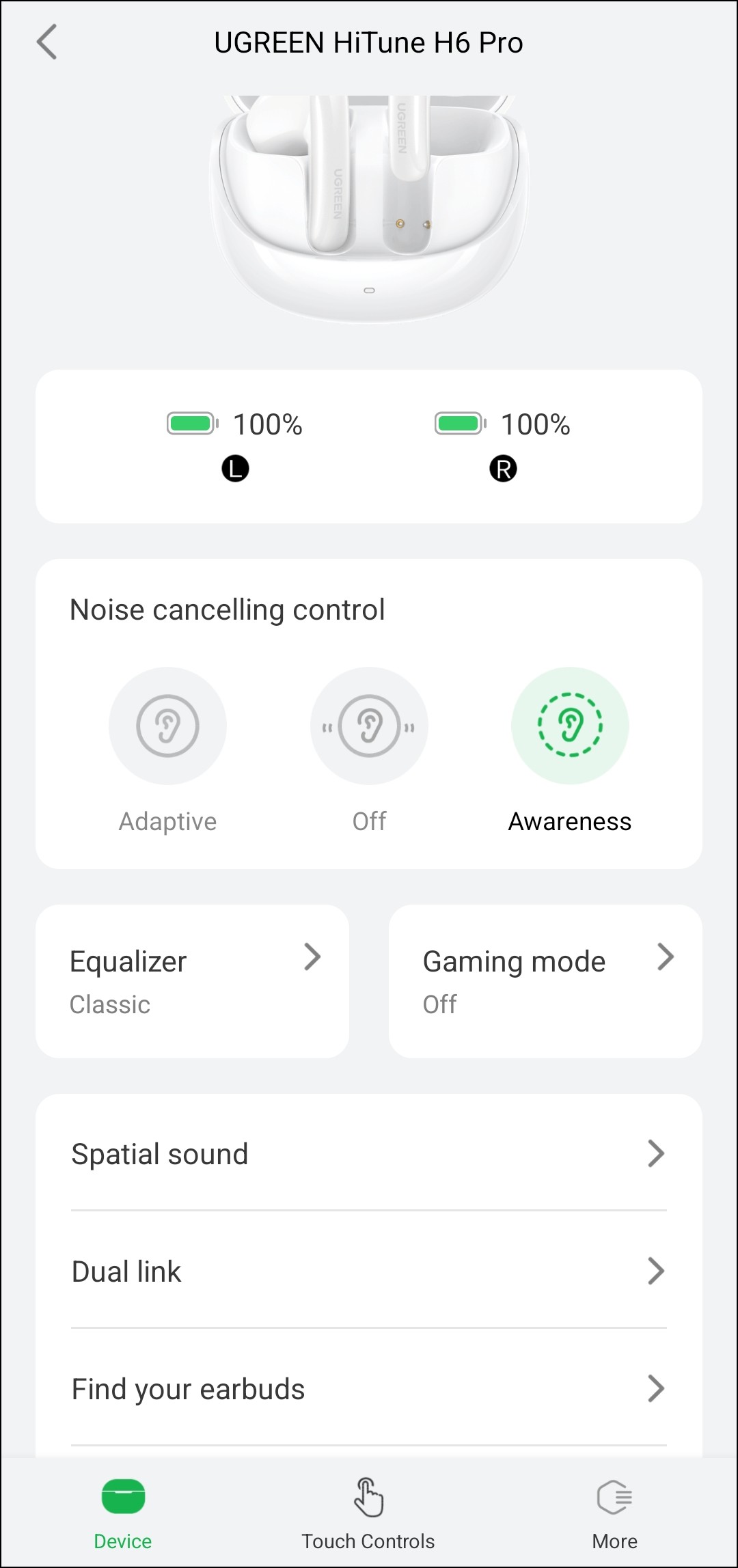 Управление гарнитурой осуществляется с помощью приложения Ugreen Home, которое стоит непременно использовать — как минимум потому, что без него не удастся активировать LDAC и мультипойнт. Скачивать версию под Android лучше напрямую с сайта производителя, QR-код со ссылкой есть в инструкции. Версия для устройств под управлением iOS тоже имеется, но отзывы пользователей о ней не очень хорошие — возможно, с грядущими обновлениями ситуация улучшится. Перевода на русский пока нет, но требуемое знание английского минимально — разобраться можно без труда.
