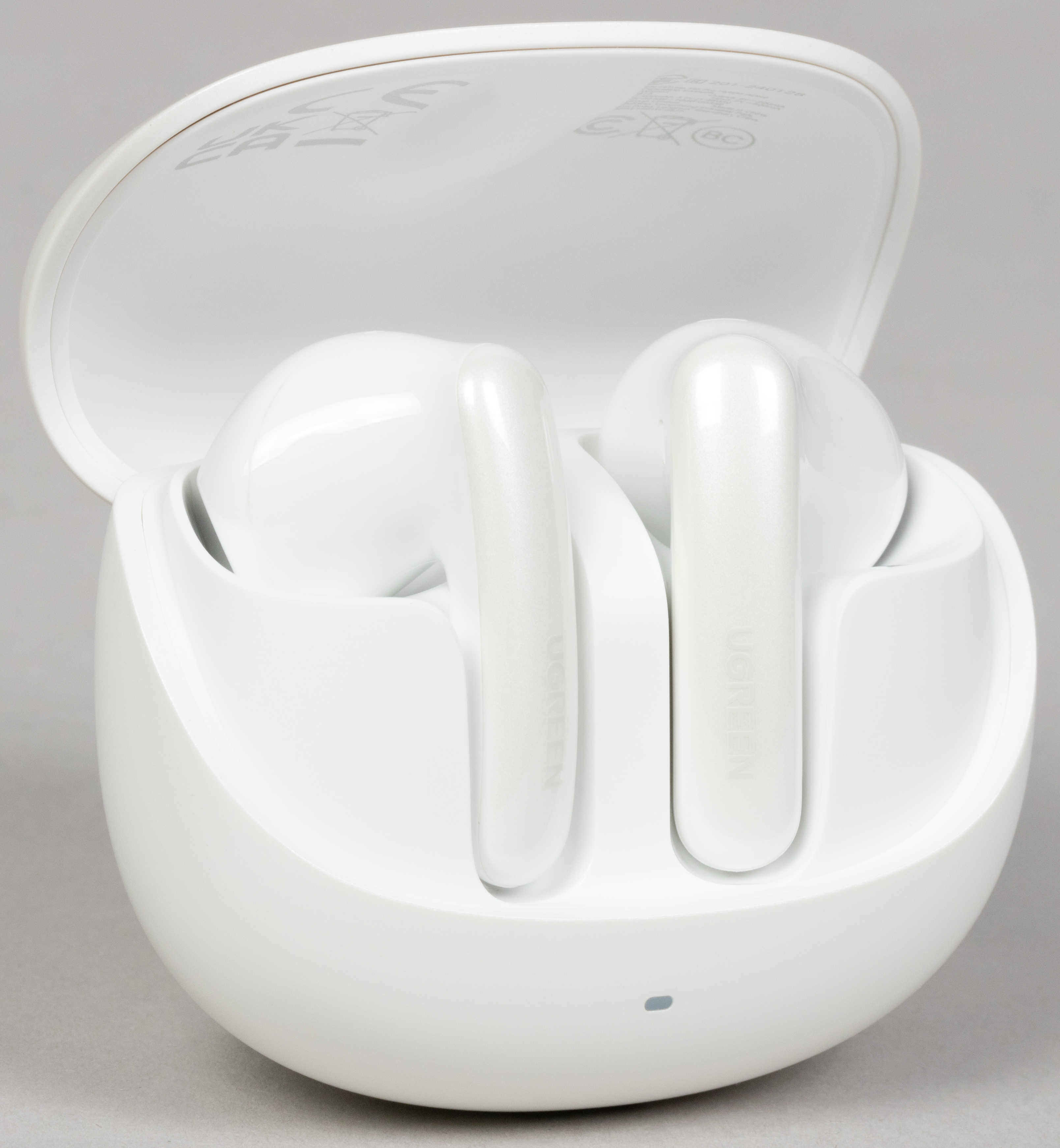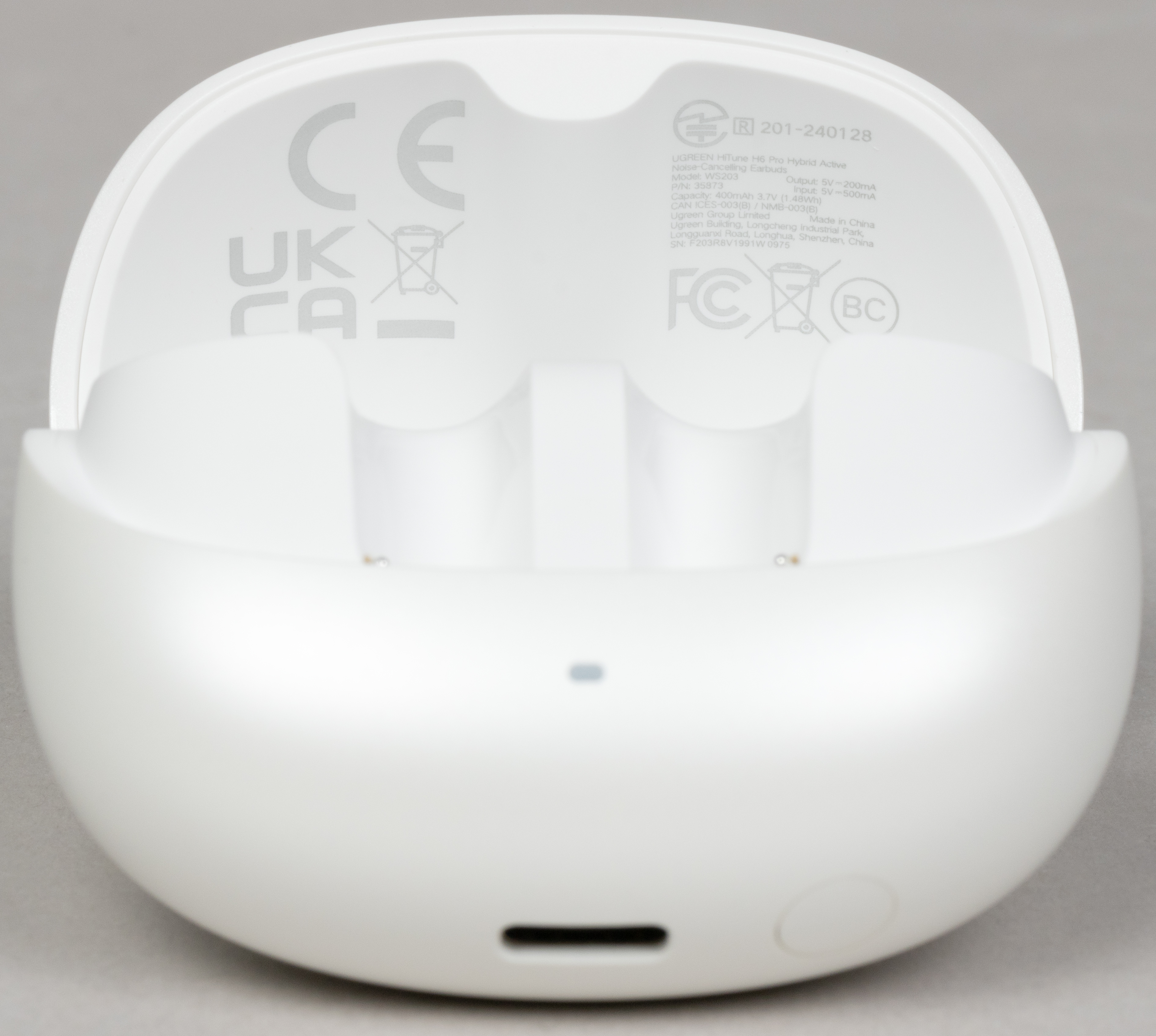 Но вот «тест на погремушку» кейс Ugreen HiTune H6 Pro не проходит — даже если просто слегка потрясти его, наушники начинают биться об стенки корпуса с характерным звуком. Выступы по форме округлой части наушников на внутренней поверхности крышки могли бы исправить ситуацию, но их там нет. Всё, что мы там обнаружили — это логотипы систем сертификации и прочую вспомогательную информацию.
