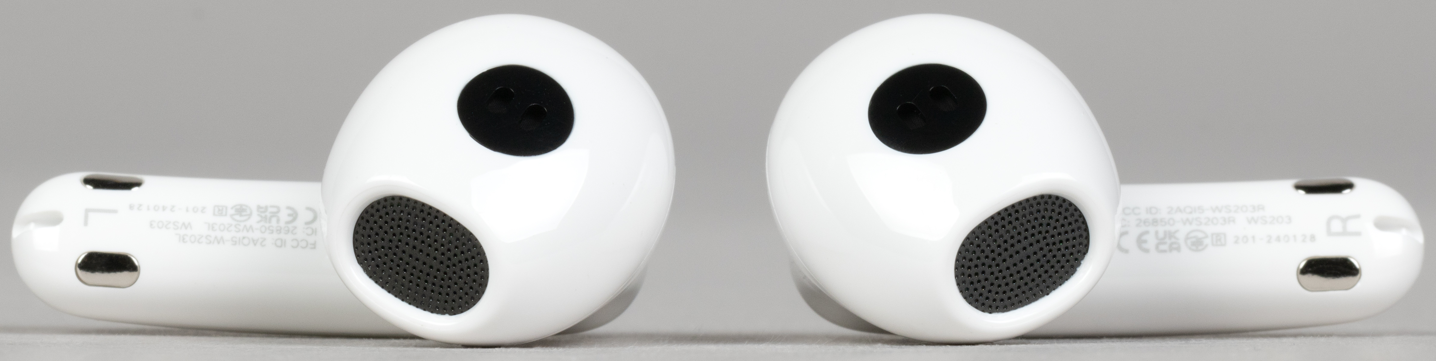 Общая длина «палочек» — 31 мм, от основания округлой части — 18 мм. За распущенные длинные волосы, шарфы и поднятые воротники гарнитура цепляться не будет. На внутреннюю сторону ножек нанесены более-менее различимые обозначения «правый-левый».