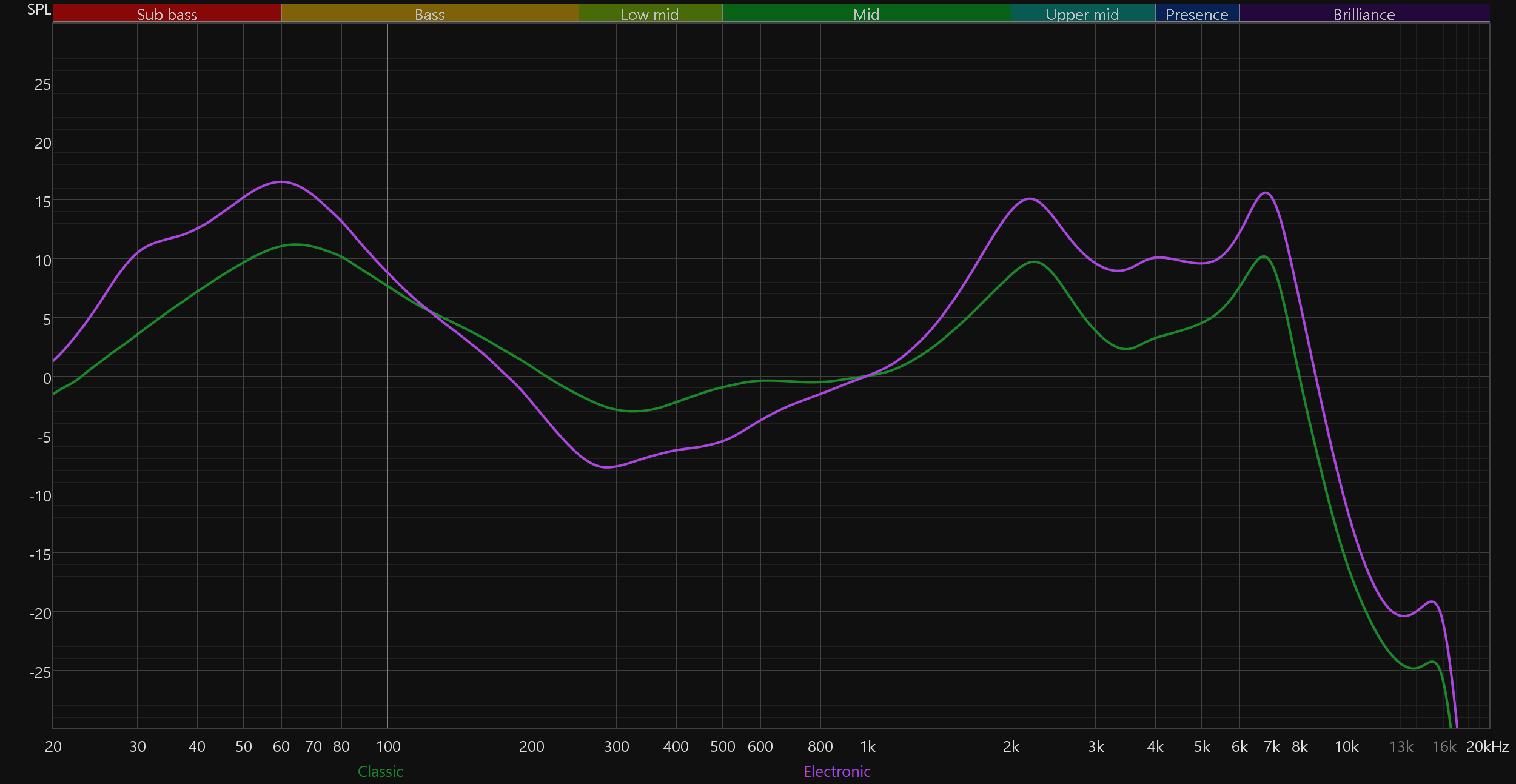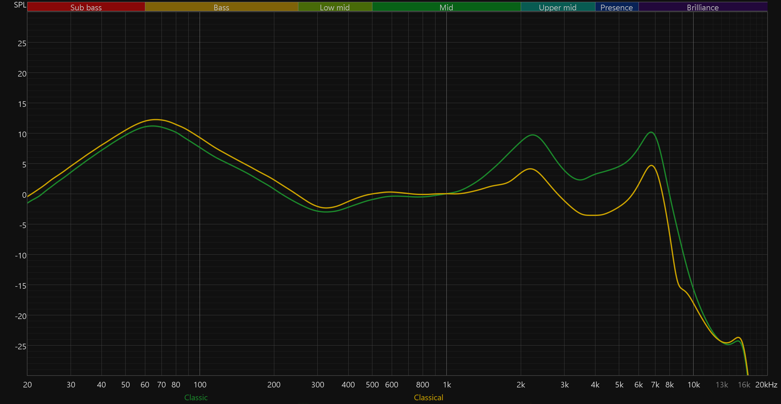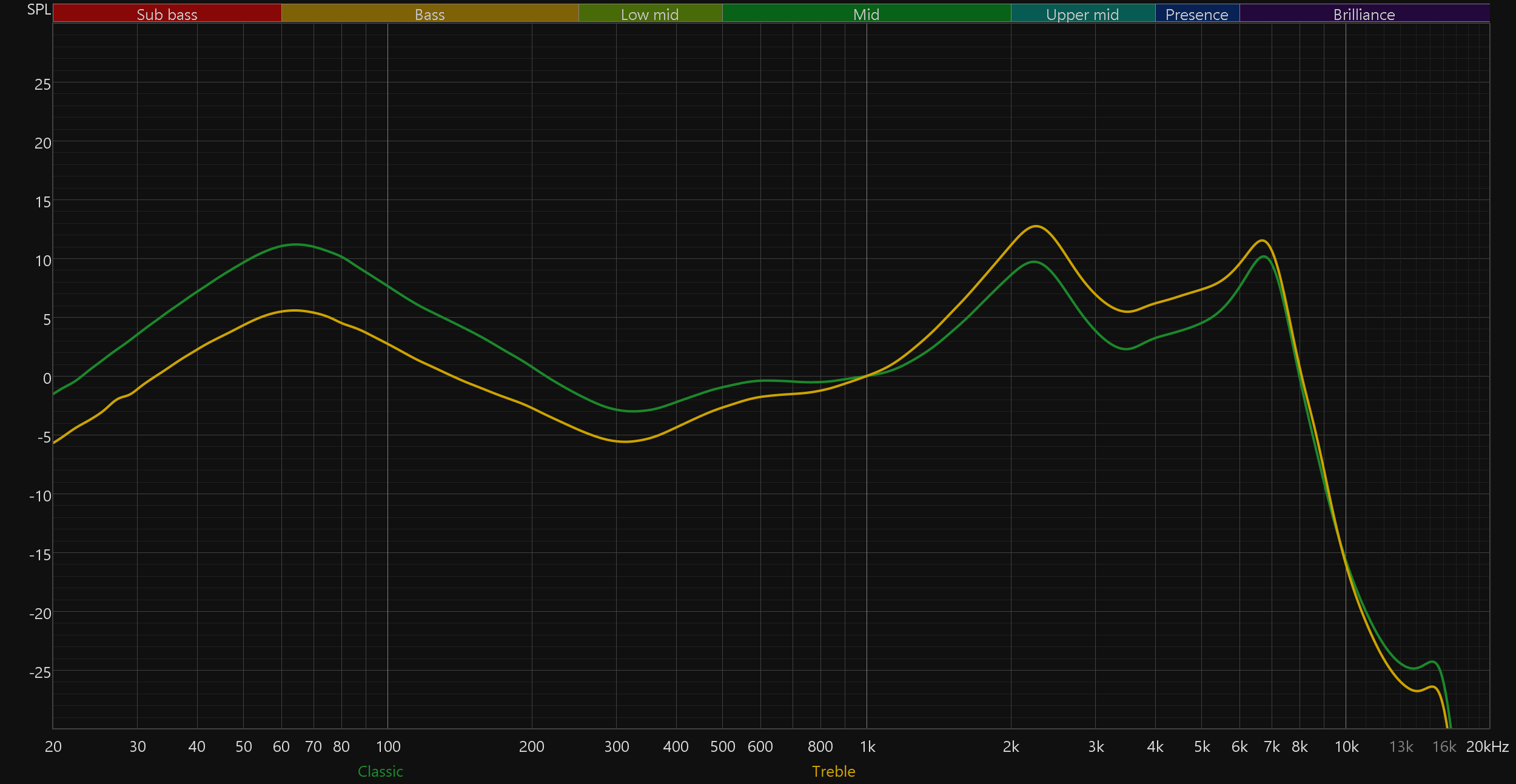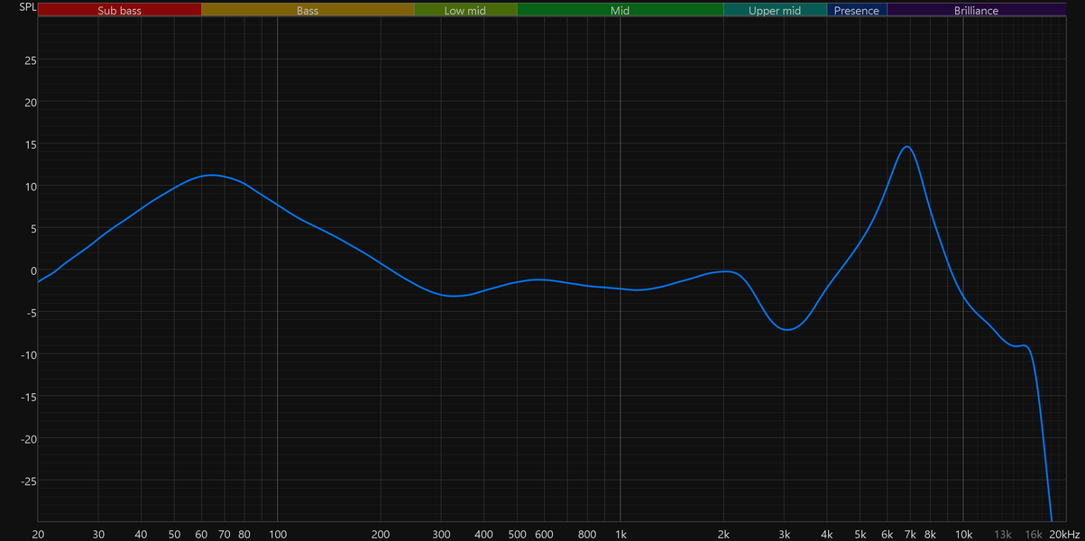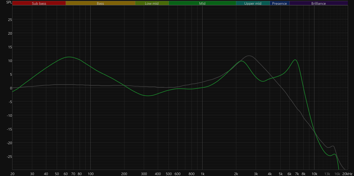График выше показан на фоне кривой IDF (IEM diffuse field compensation), предоставленной производителем используемого стенда. Ее задача — помочь скомпенсировать резонансные явления в имитированном слуховом канале и особенности оборудования, создав «звуковой профиль», максимально корректно иллюстрирующий то, как звучание наушников воспринимается слушателем. Ее можно рассматривать как адаптированный под конкретное устройство аналог так называемой «кривой Хармана», созданной командой Harman International под руководством доктора Шона Олива. Скомпенсируем полученный график АЧХ в соответствии с кривой IDF. В таком виде он наиболее полно иллюстрирует наши субъективные впечатления от прослушивания Ugreen HiTune T3 Pro.