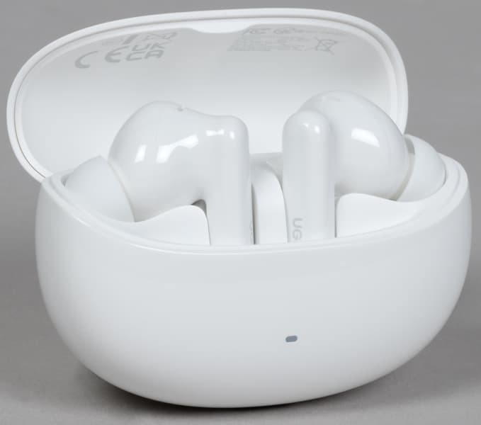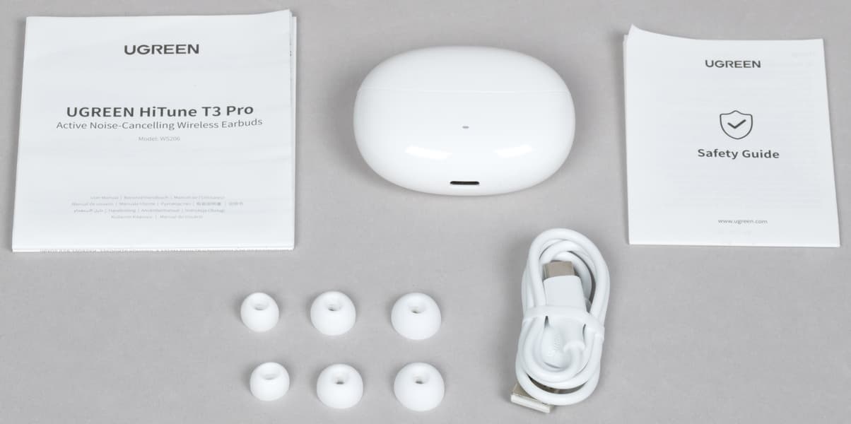 В комплект поставки входят наушники в кейсе, документация, кабель USB-A — USB-C для зарядки длиной 30 см, три пары сменных силиконовых насадок.